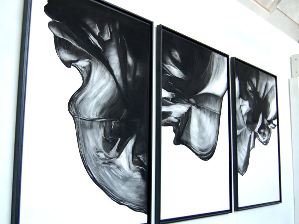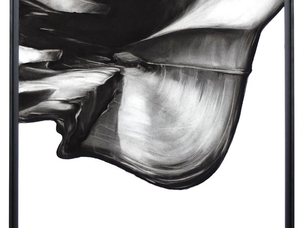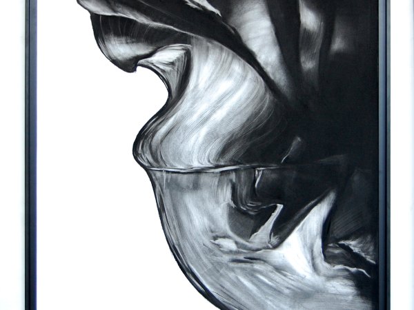 Charcoal, black stone and white highlights on monted paper, black frame. Private collection