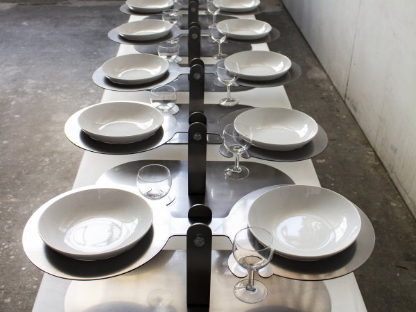 Acier découpé au laser, 32 verres, 32 assiettes en céramique, 32 cuillères, repas commandée à une cheffe cuisinière, 32 personnes.