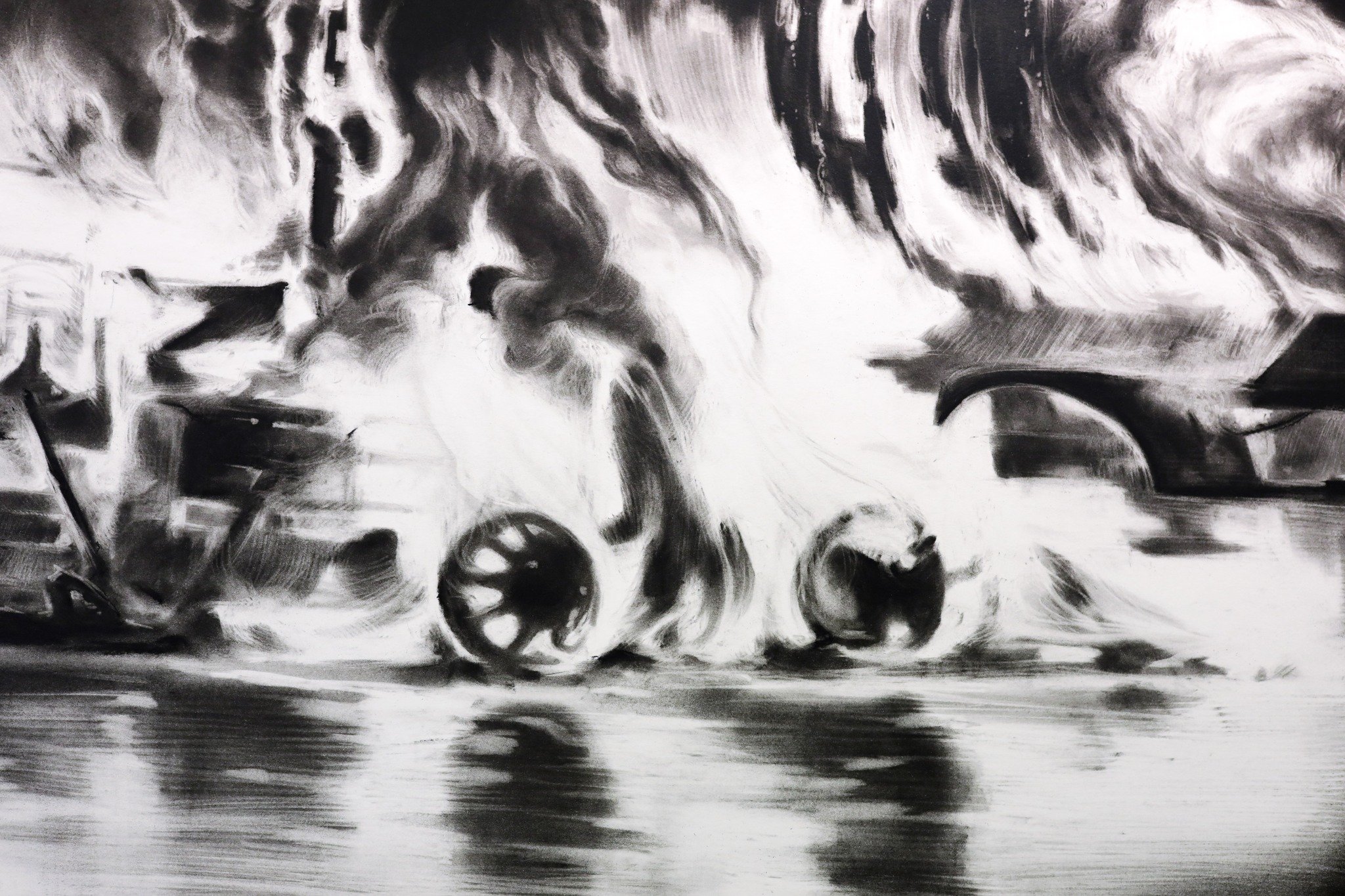 Ces deux dessins représentent des paysages urbains en proie à la violence. On y perçoit des véhicules en feu : un semi-remorque et un camion-citerne. Comme habituellement dans la pratique de François Xavier Chanioux, le mouvement habite le dessin. À la fois hyperréalistes et pourtant réalisés en aplats noirs avec de rares rehauts de blanc, ces deux œuvrent nous font valser entre la fiction et la réalité. Est-ce des images réelles issues de l’actualité ? Ou l’image d’un scénario mental sensible et fictif tout droit sorti de mon imagination ? Ici, François Xavier Chanioux nous met face à des images familières, que nous aurions pu consulter dans l’actualité, peu importe le support : presse écrite, journaux télévisés, fil d’actualité des réseaux-sociaux, etc.