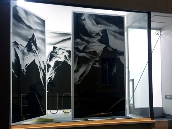 Invité à investir la galerie Exuo, ma proposition était de présenter des fusains de grands formats en qualité de sculptures. Posé directement au sol, le triptyque se veut imposant, à l’image d’une parois infranchissable. Pour accentuer la stature monumentale des œuvres, une très large proportion du tableau est recouverte intégralement de noir uniforme. Tel des colosses, les dessins érigés à la verticale, s’obstruent mutuellement et entravent la visibilité de la Galerie.