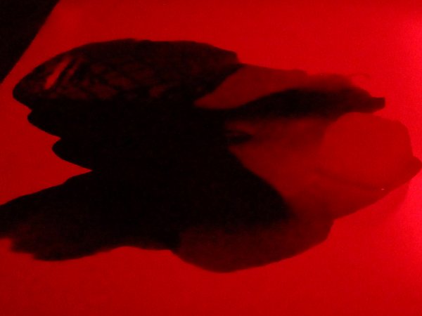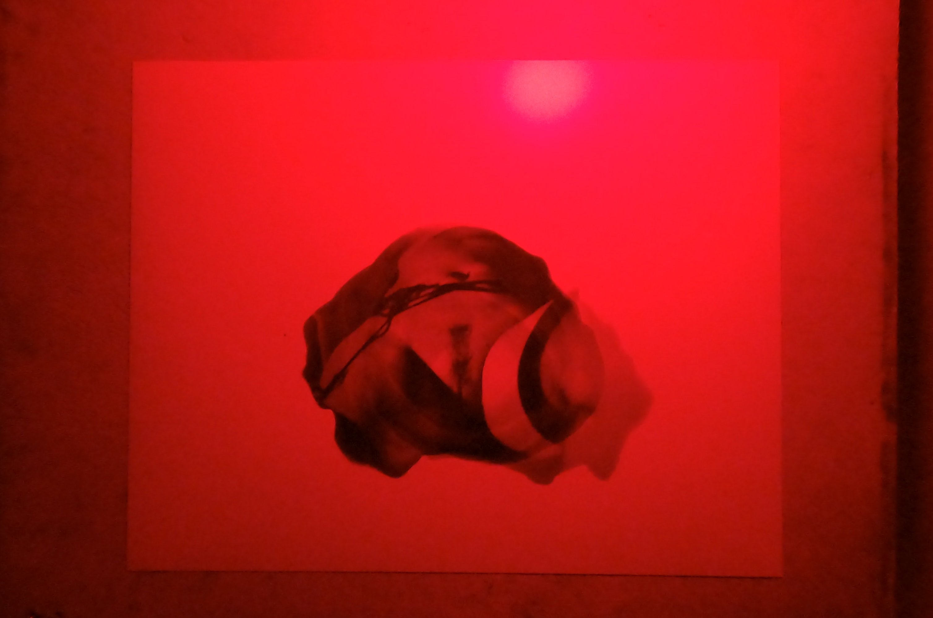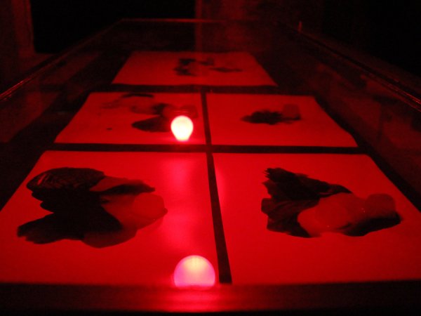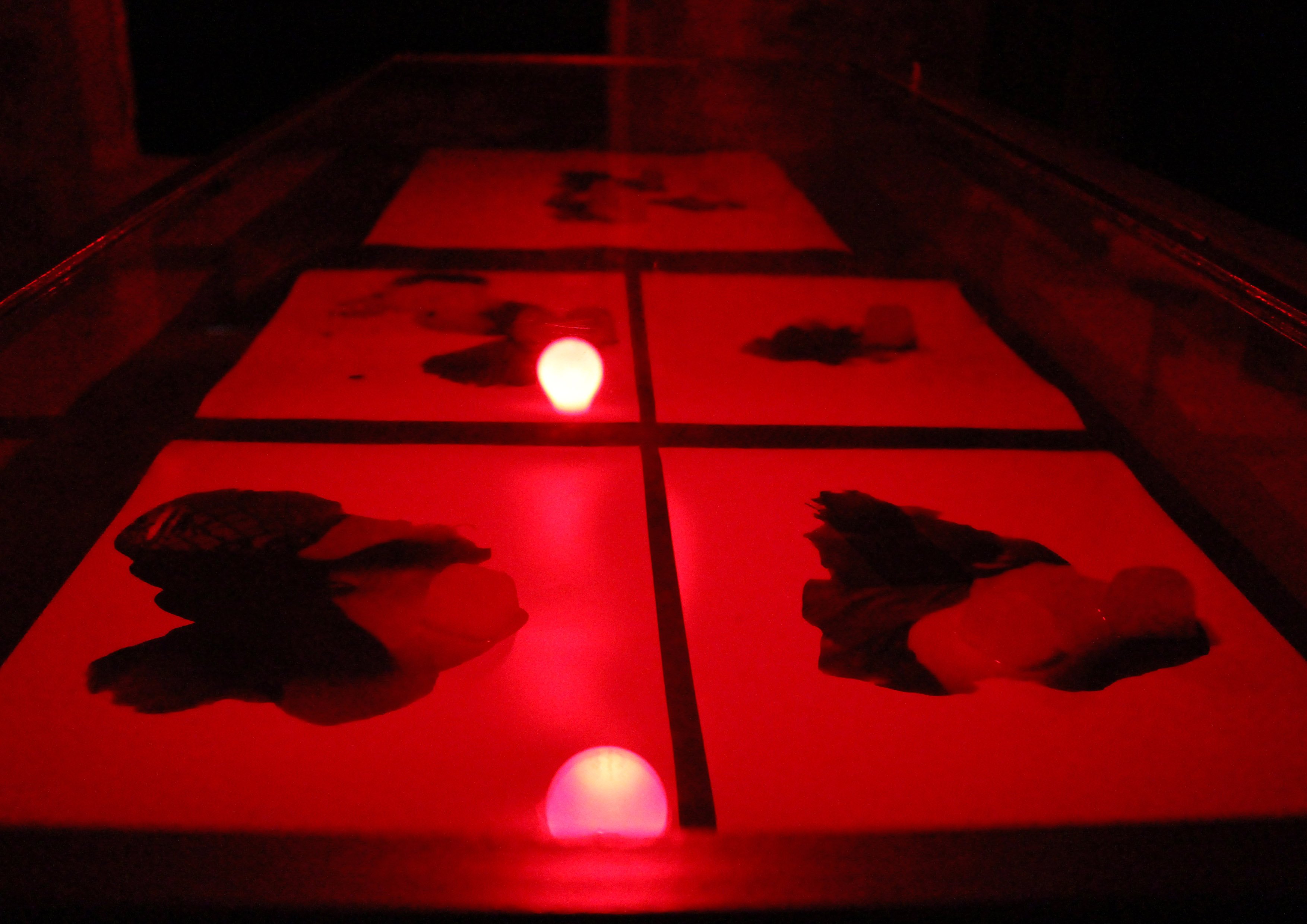 Glass showcases, handlamp, inactinic bulbs, BW photosensitive paper preliminary exposed, photographic developper icecubes. Variable size, variable lenght.