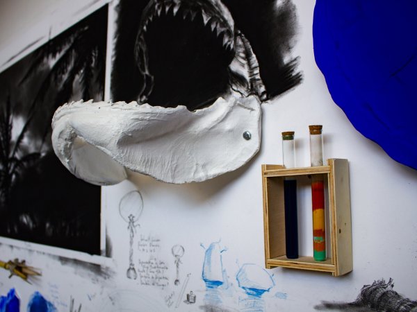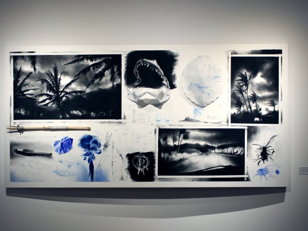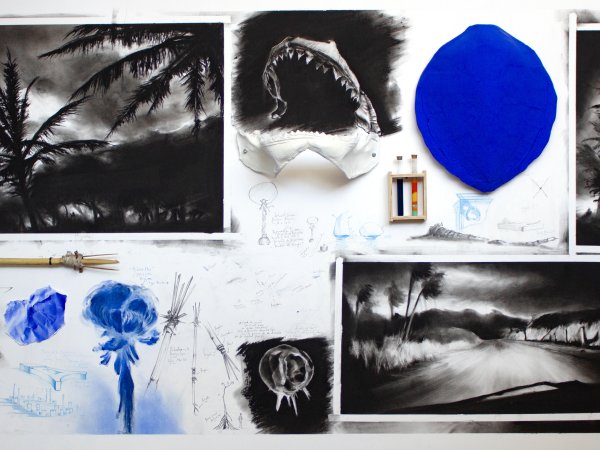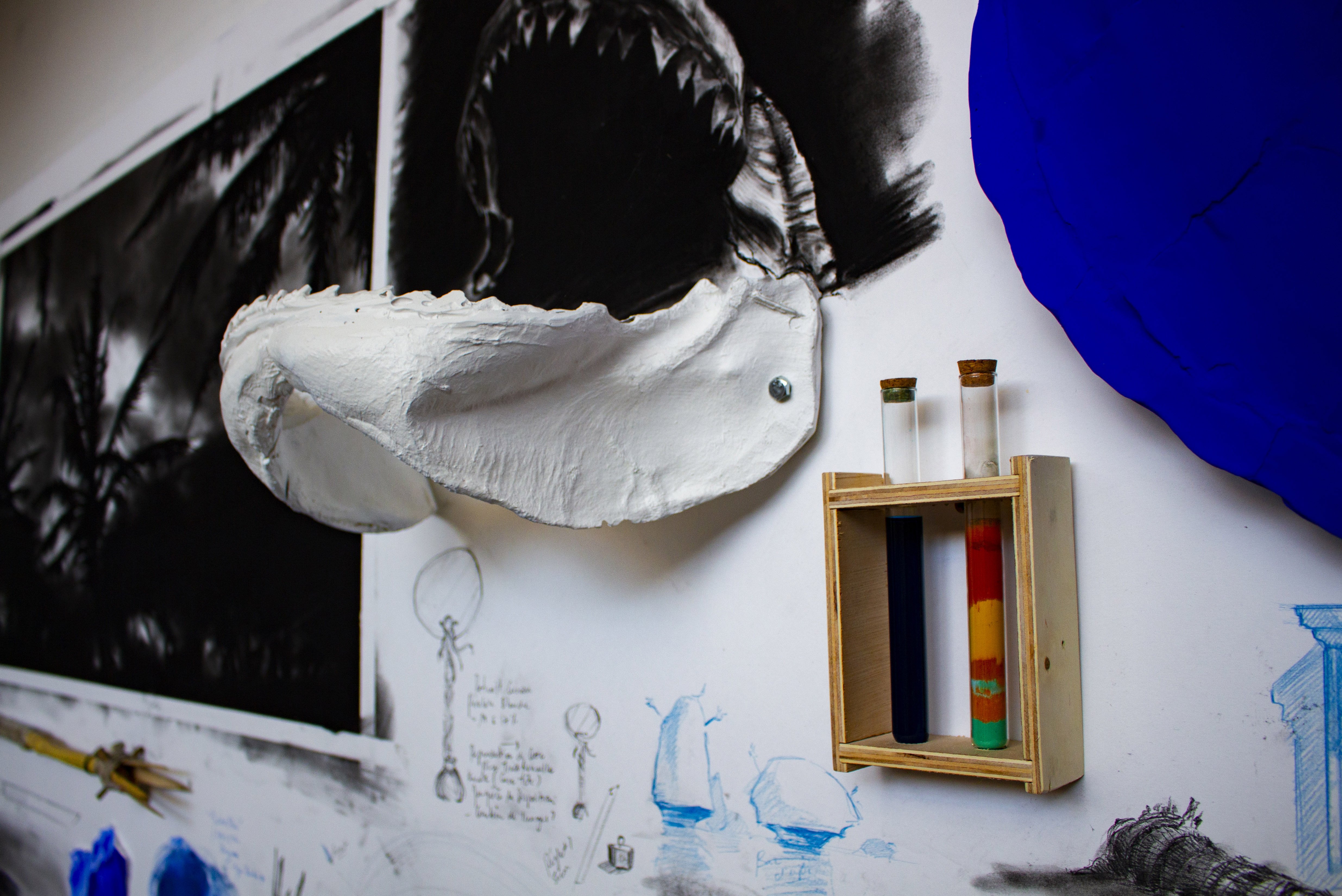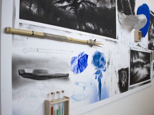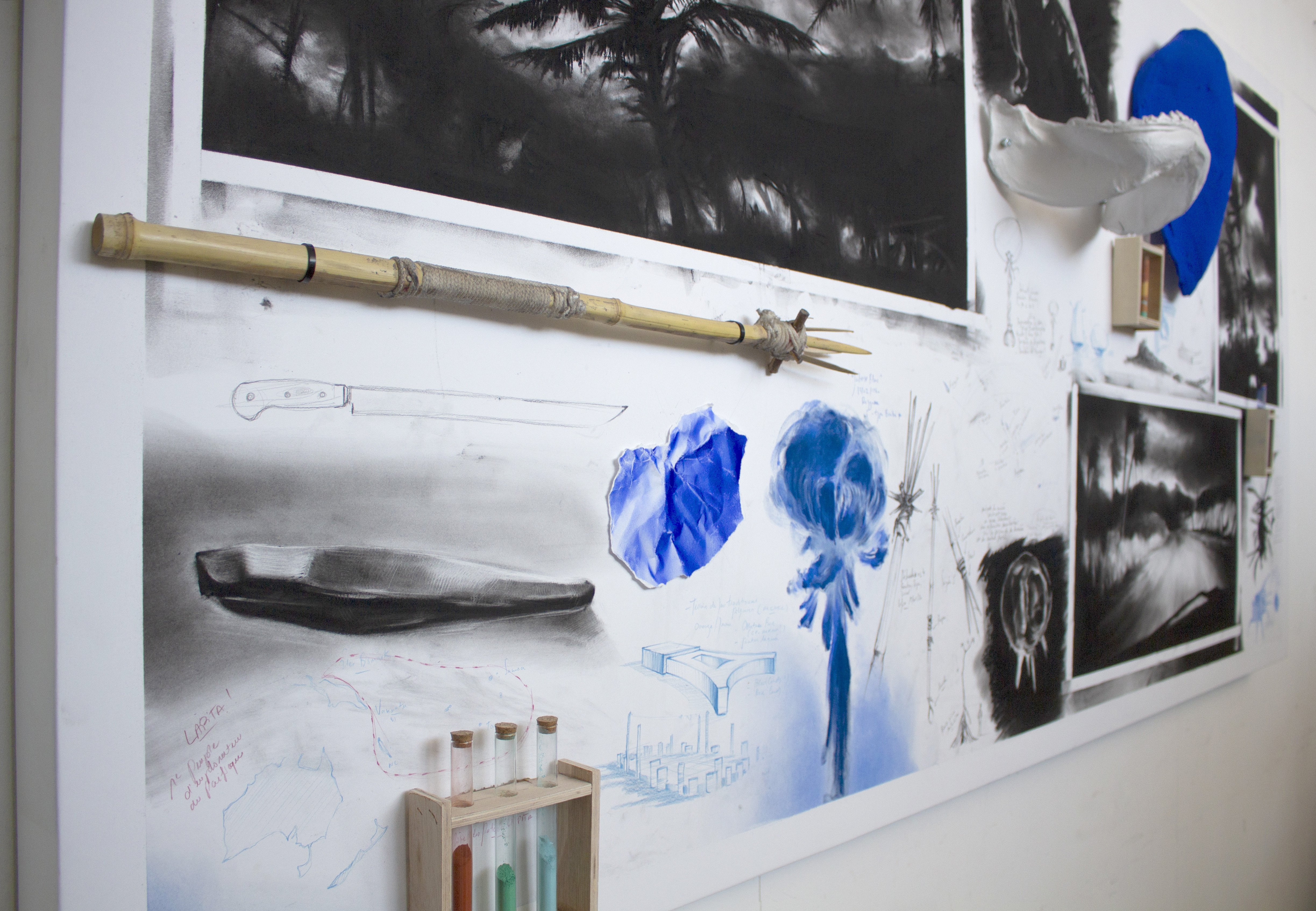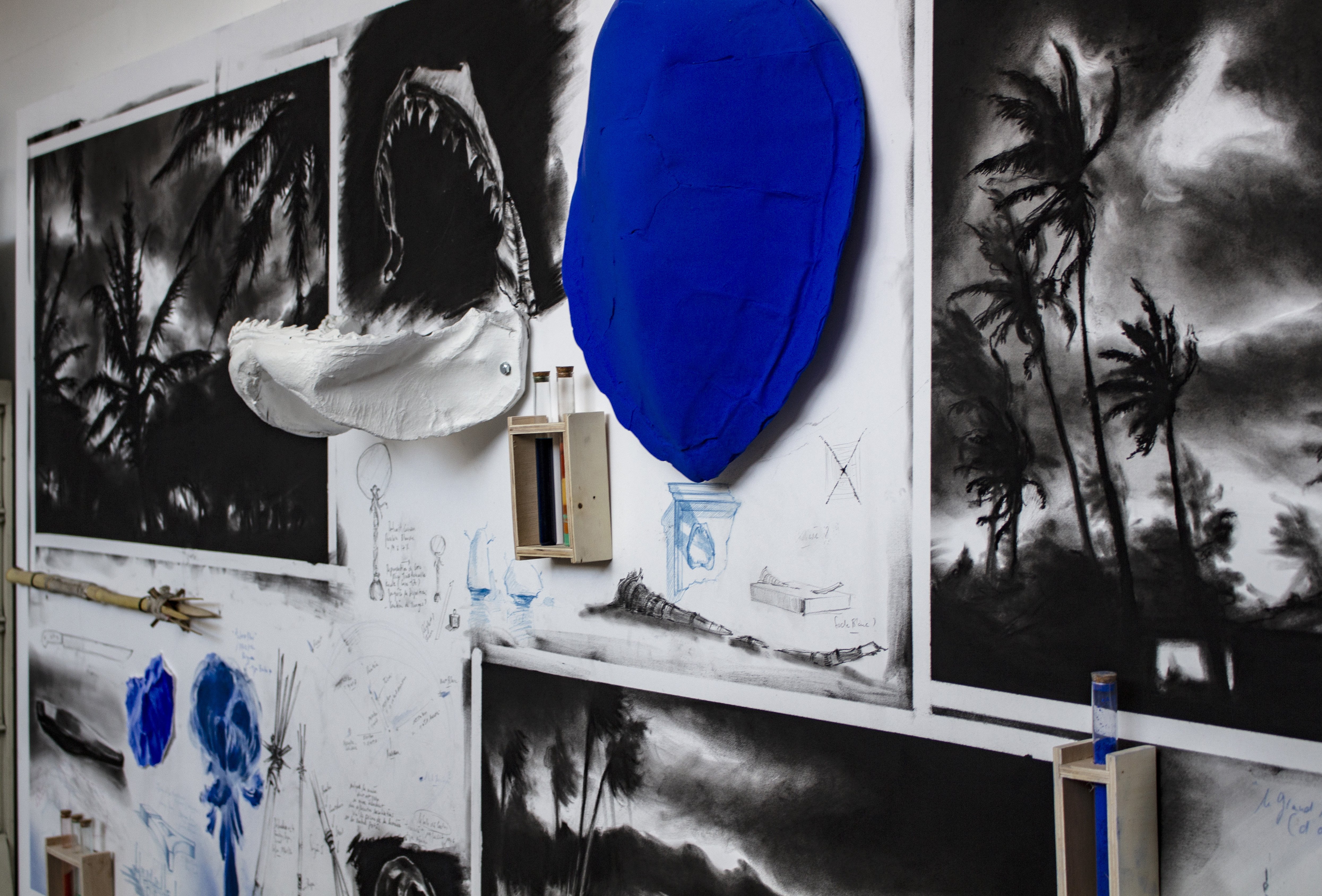 À l’image du carnet de bord, le dessin/sculpture fait état du laboratoire artistique nécessaire et de toutes les directions embrassées lors des résidences artistiques. Cette œuvre d’art total télescope les médias pour inscrire les préoccupations artistiques, plastiques et culturelles assimilées lors des différentes étapes des projets et plonge le spectateur dans l’intimité et le cheminement créatif.