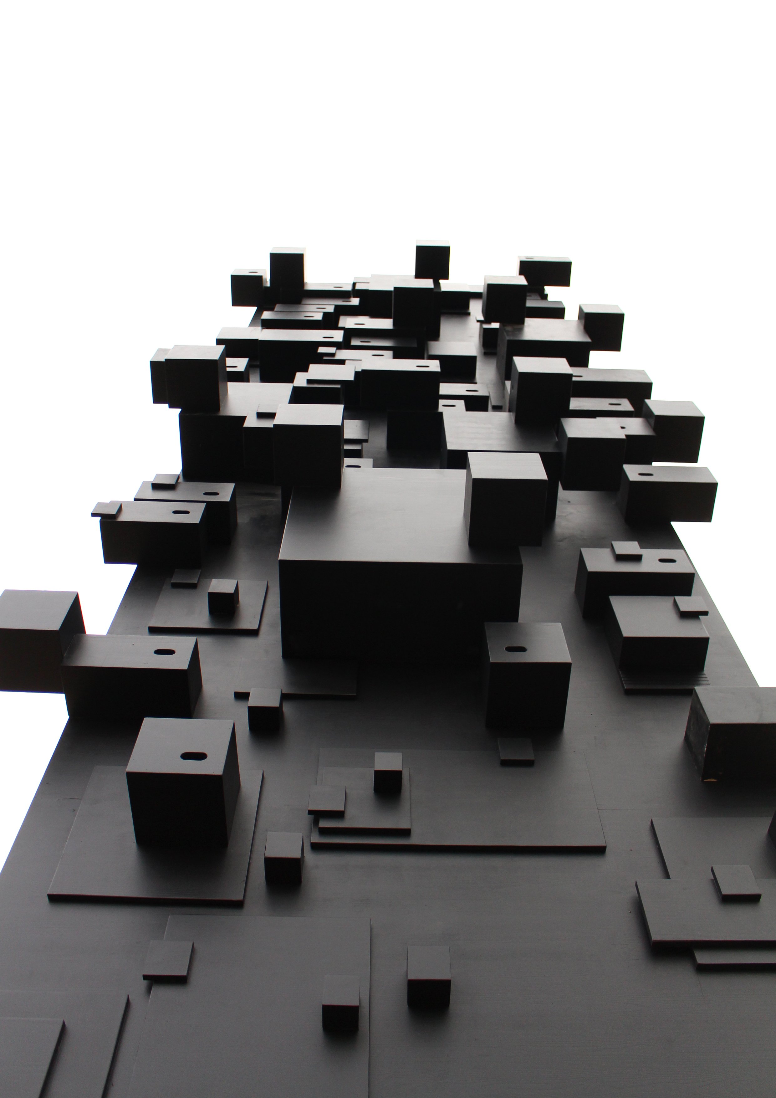 Spruce, concrete, steal, rock wool, glass, matte black saturator, matte paint. 324 x 91 x 28 inches.