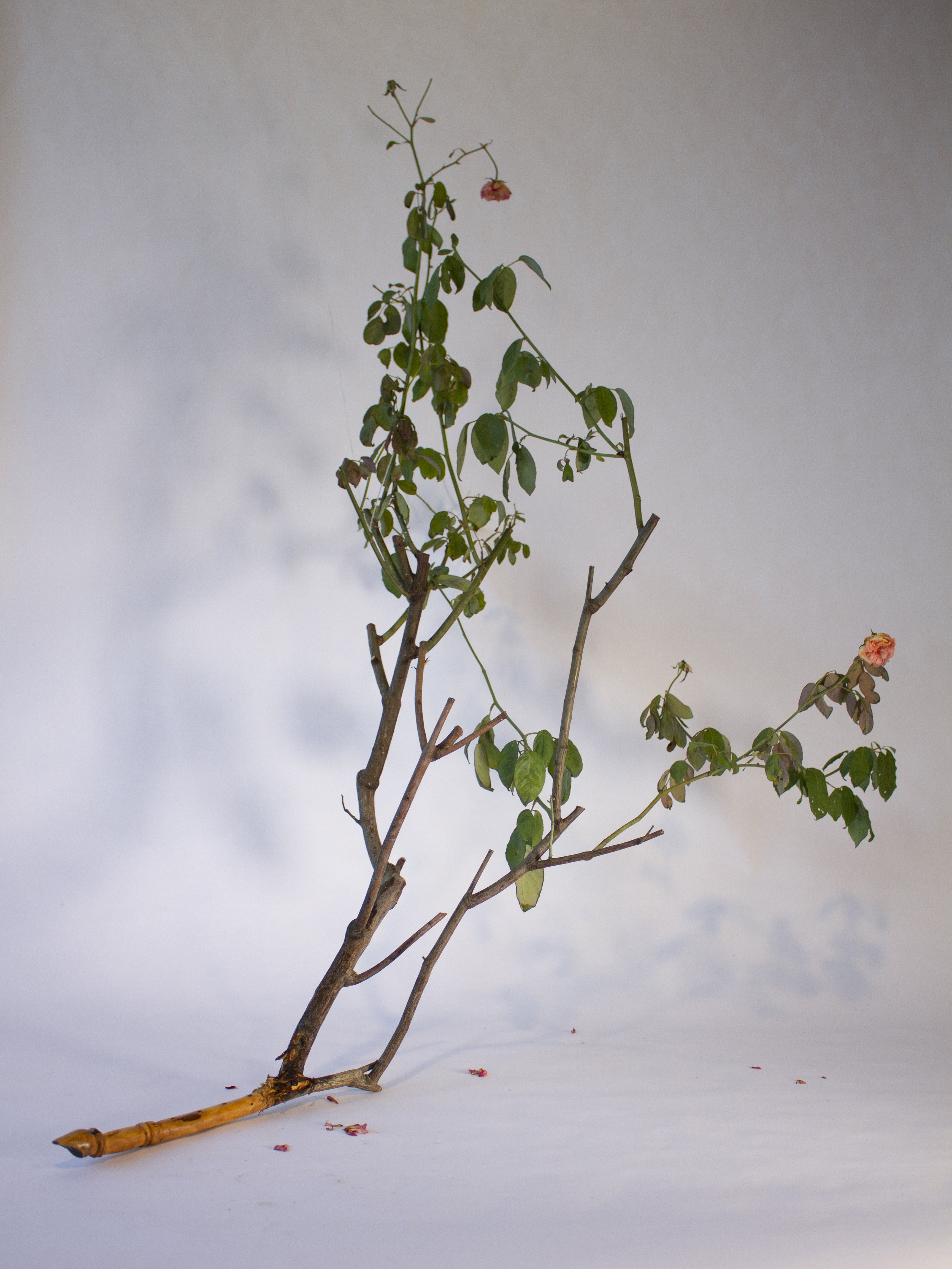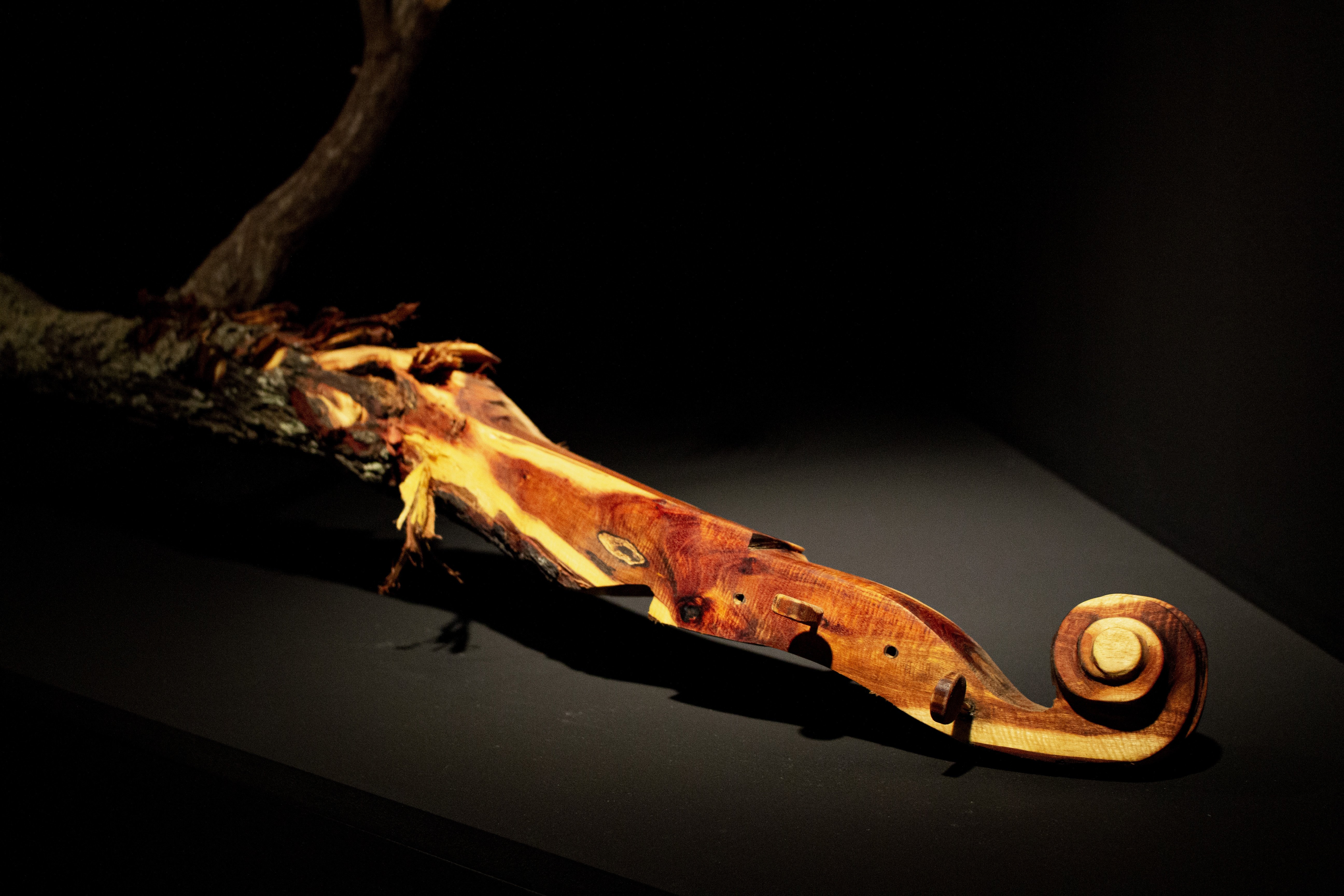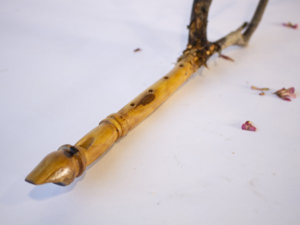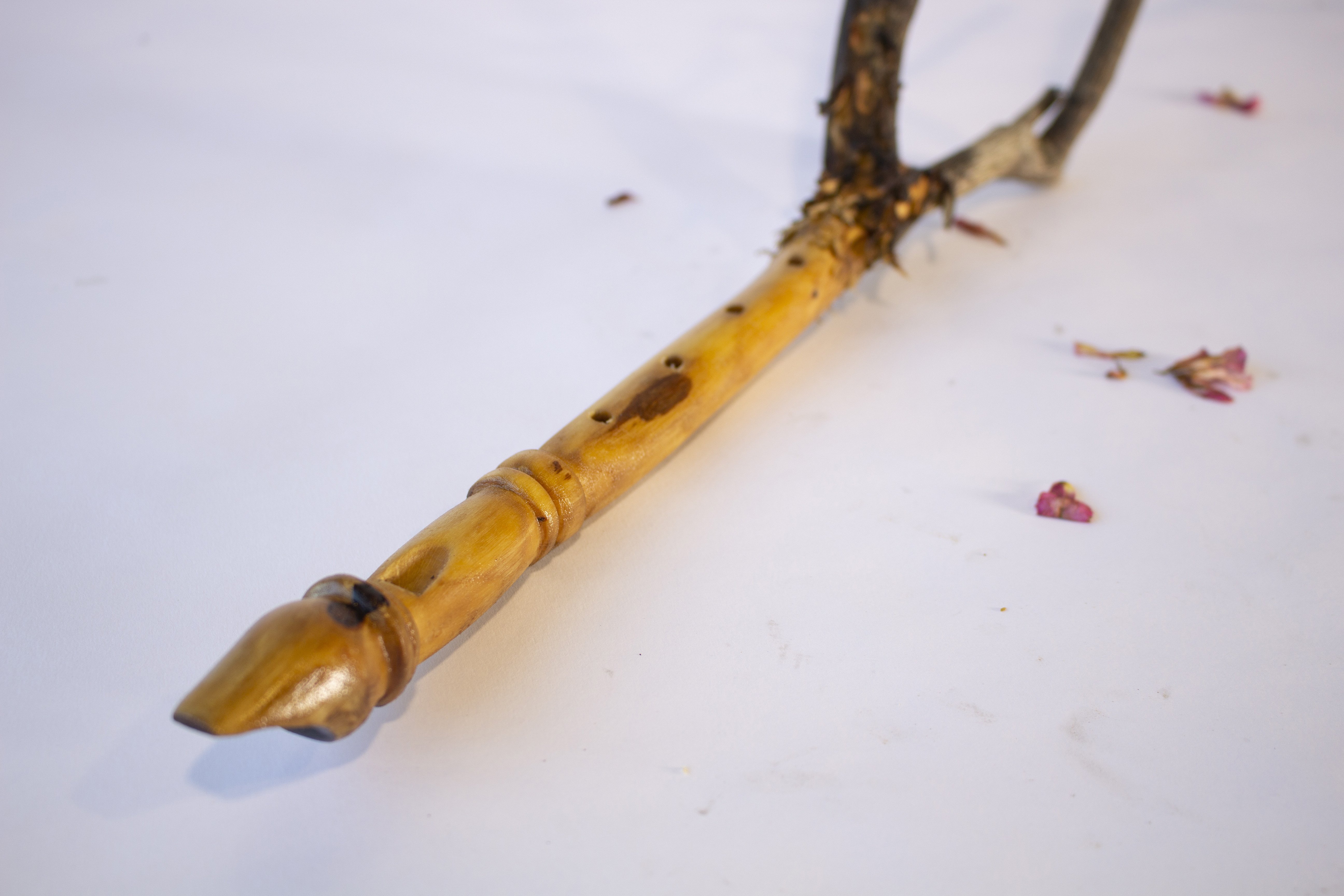 Deux œuvres de cette même série sont exposés dans la salle Kavitara. Les instruments sont issus d’un rapprochement contextuel et hasardeux vécus lors de la résidence artistique. La flûte de la grotte d’Hohle ( 35000 AP) dans le Jura Souabe au sud de l’Allemange est considérée par la paléontologie comme le premier instrument de l’humanité. Dans cette même dynamique de marquer un point de rupture, une flûte est confectionnée dans une branche de rosier et ébauche cette subtil évolution nécessaire pour devenir Art.