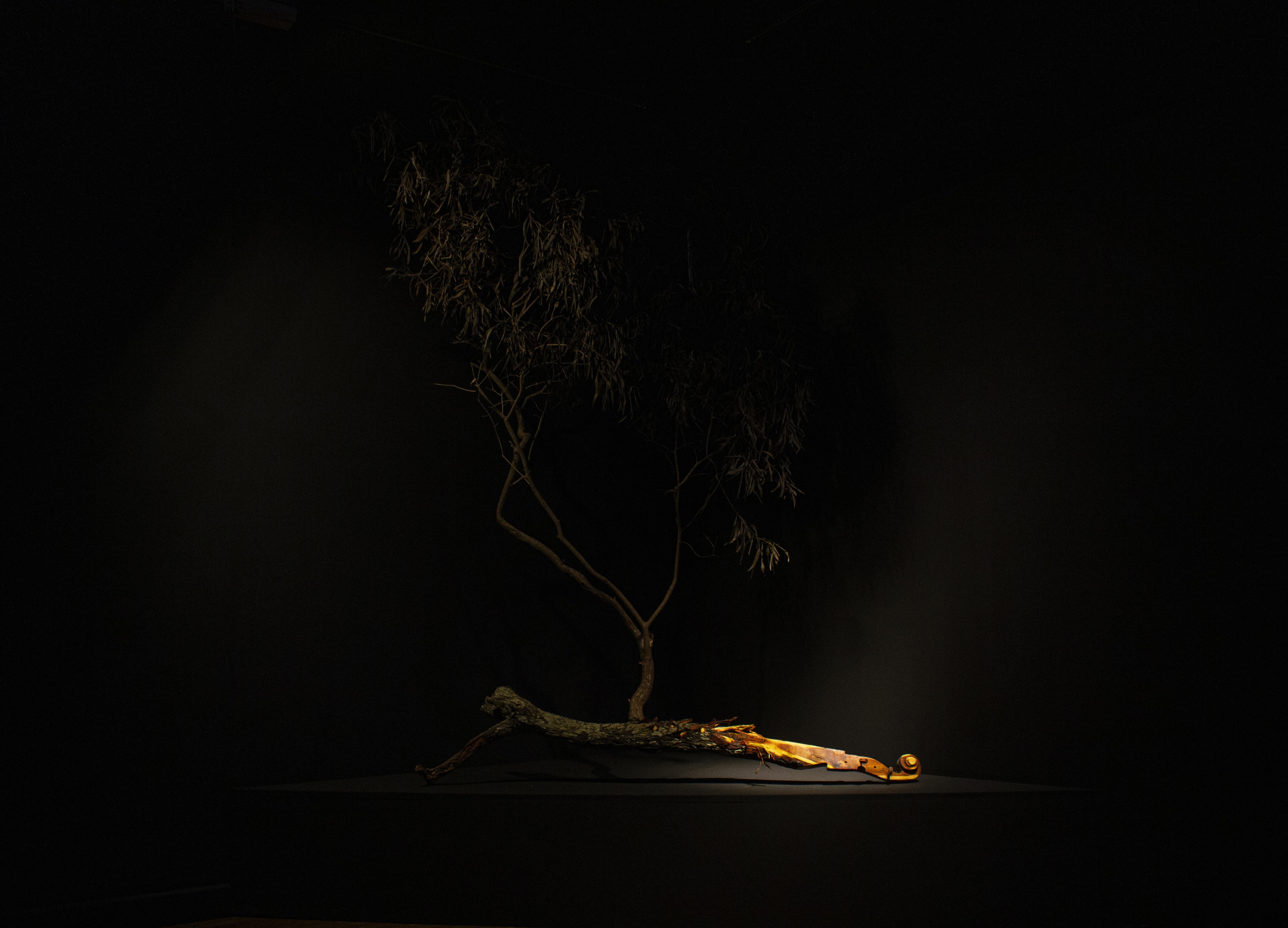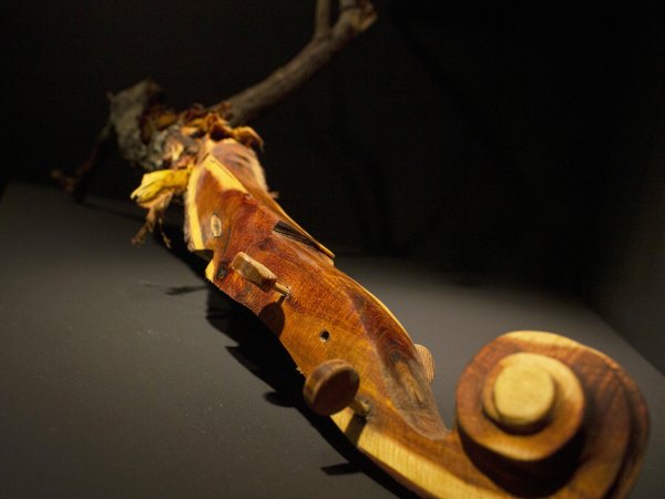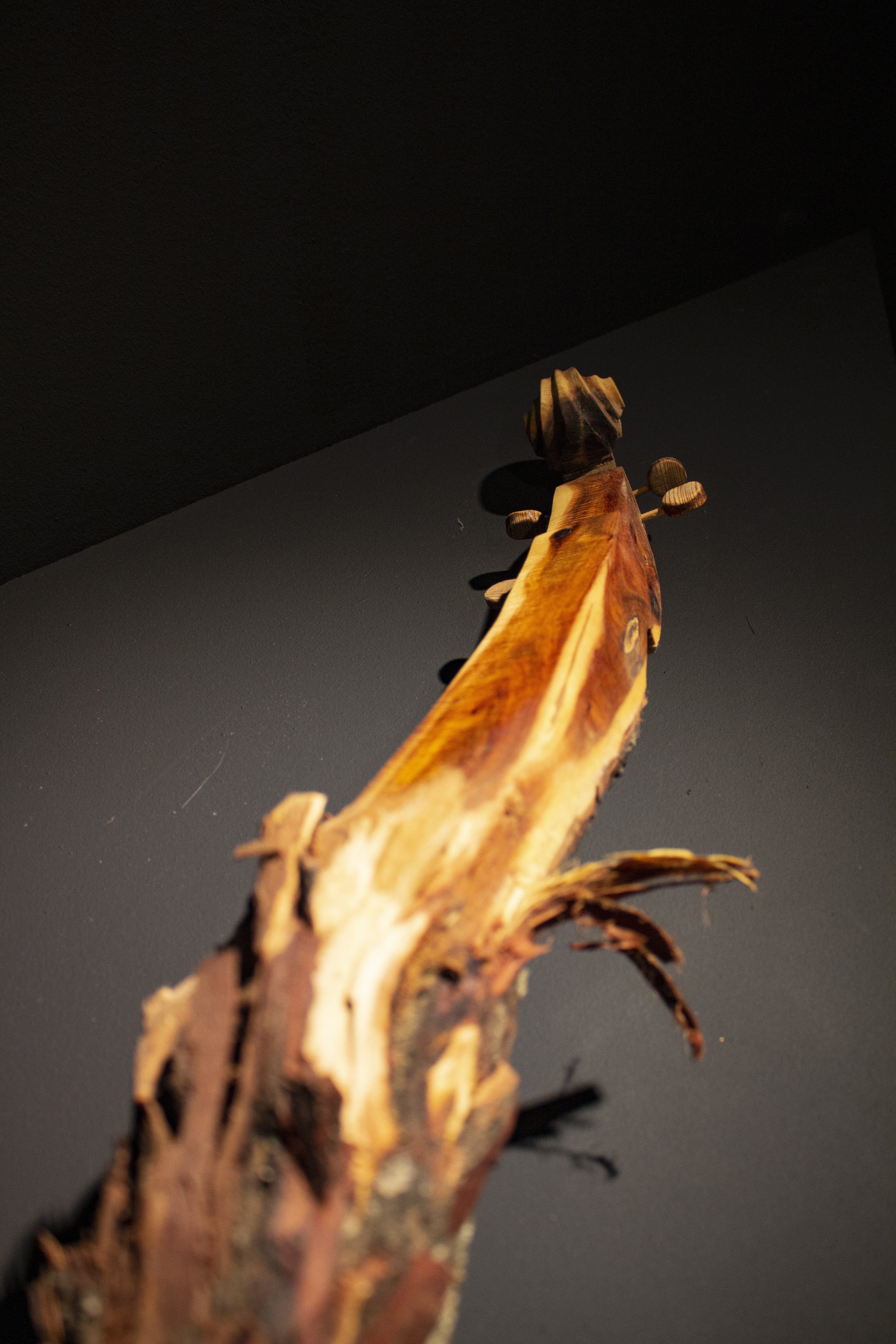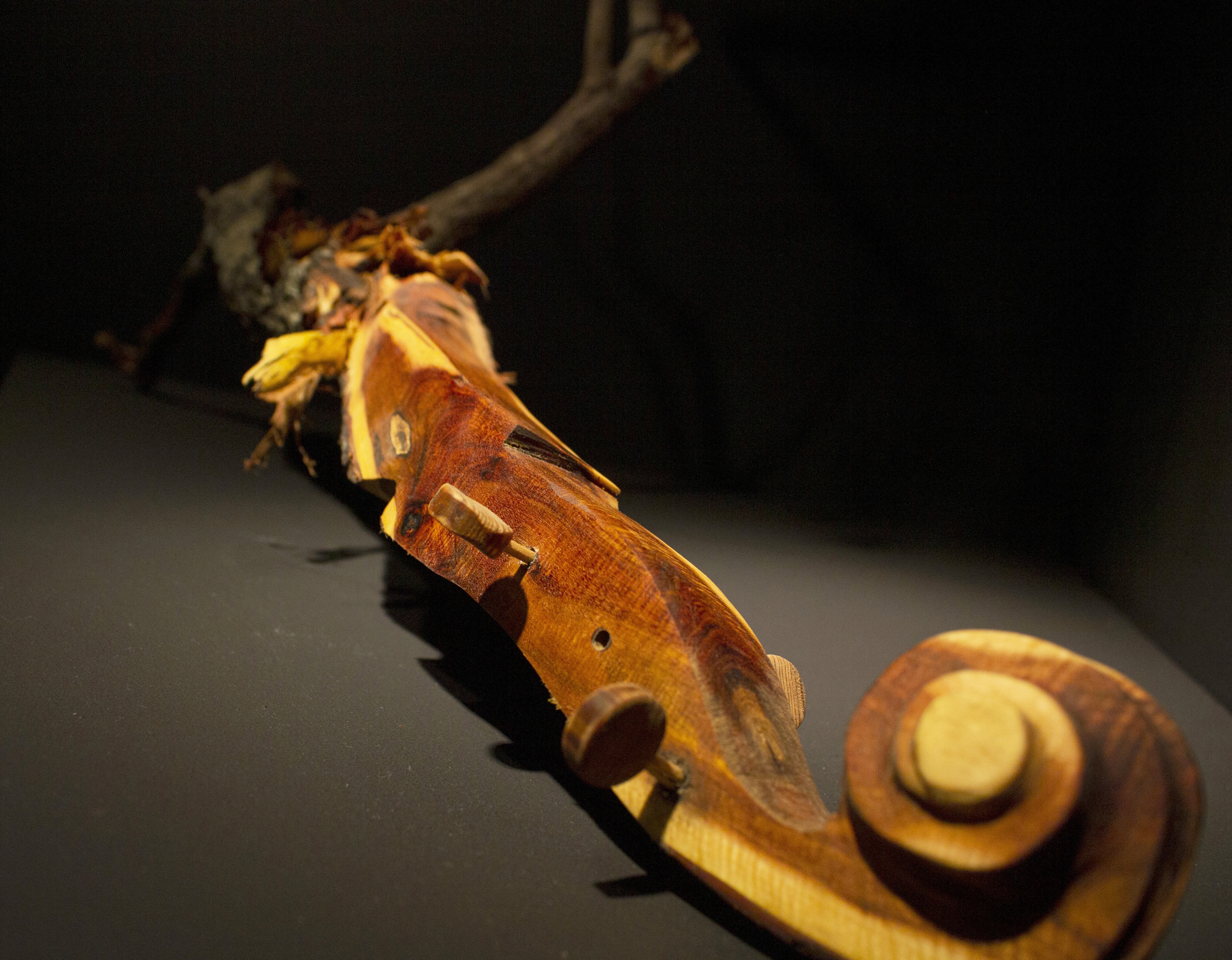 Deux œuvres de cette même série sont exposés dans la salle Kavitara. Les instruments sont issus d’un rapprochement contextuel et hasardeux vécus lors de la résidence artistique. La flûte de la grotte d’Hohle ( 35000 AP) dans le Jura Souabe au sud de l’Allemange est considérée par la paléontologie comme le premier instrument de l’humanité. Dans cette même dynamique de marquer un point de rupture, une flûte est confectionnée dans une branche de rosier et ébauche cette subtil évolution nécessaire pour devenir Art.
