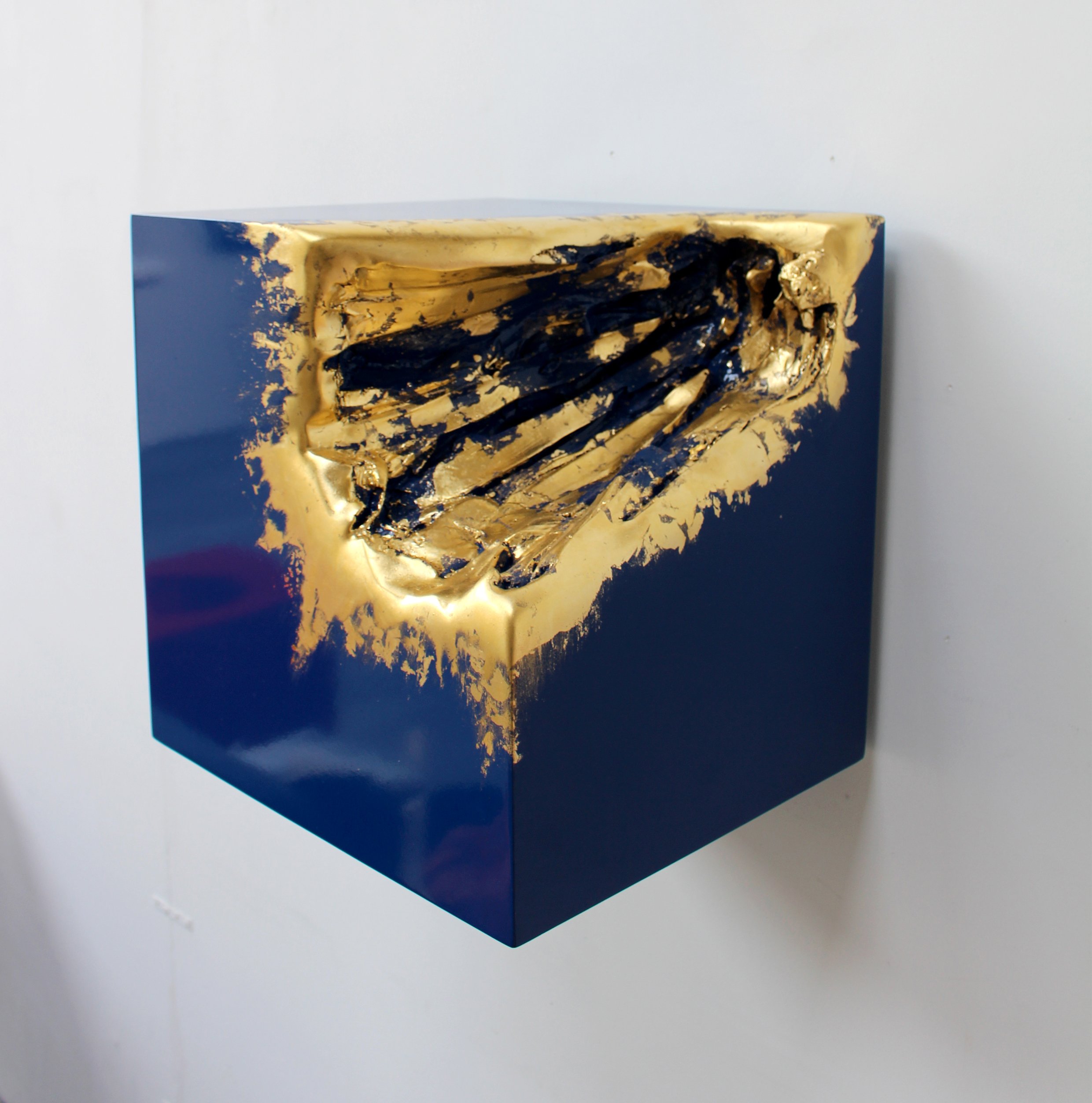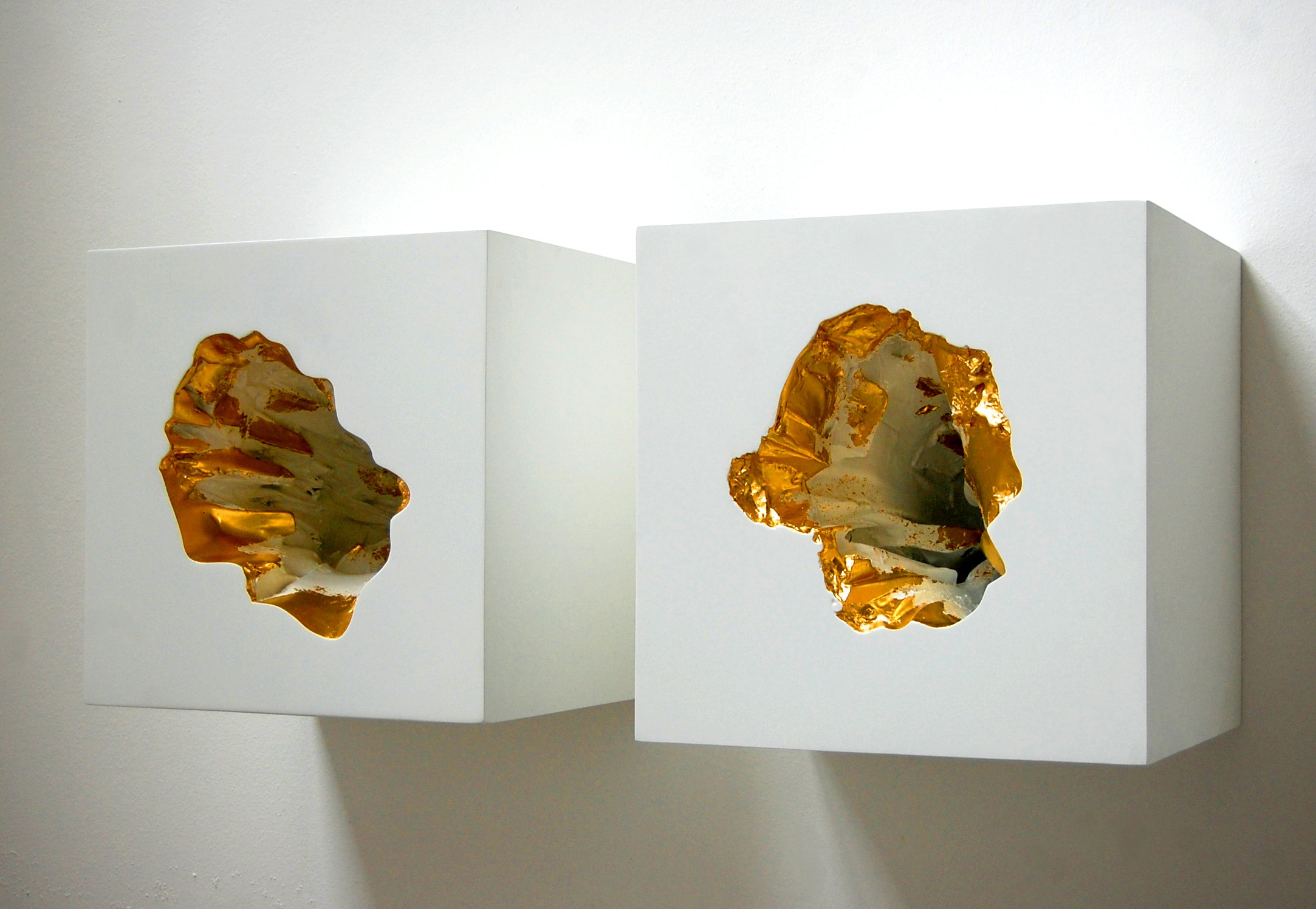 Bois, peinture laquée, apprêt, fibre, résine, feuilles d'or 22K. 40 x 40 x 40 cm. Pièces uniques.