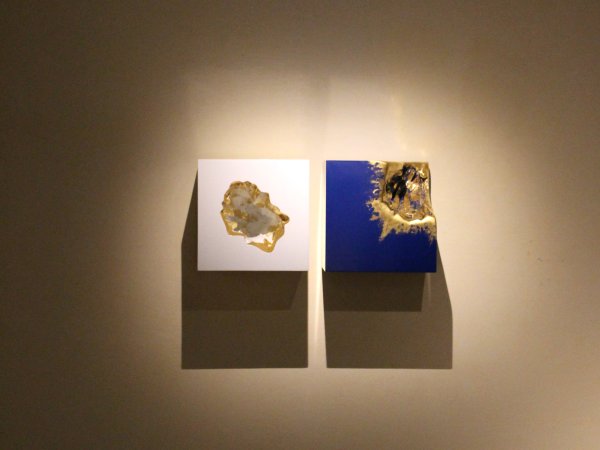 Les Cavités sont issues de l’ excavation à l’ aide d’ une pioche d’ un bloc d’ argile. Le coup de pioche, non sans évoquer la gestuelle propre aux « Forty-niners » de la ruée Californienne, est ici imprégné dans un cube blanc. Les parois recouvertes de feuilles d’ or laissent à penser qu’un objet, peux être précieux, a été déniché. Retiré au bloc, il laisse place à un gouffre, une cavité.