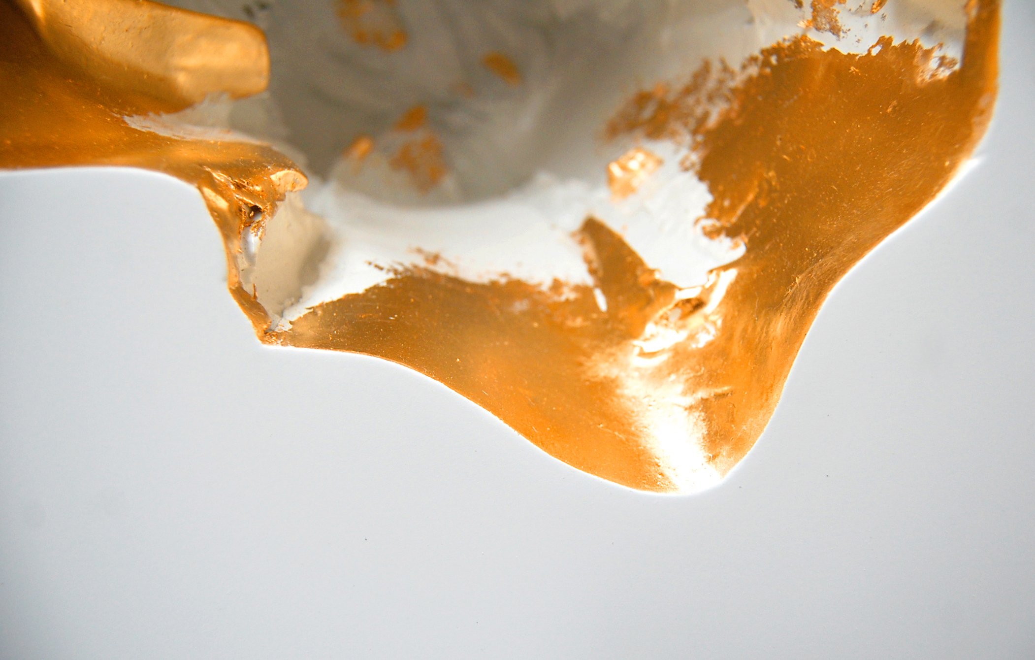 Wood, glossy paint, primer, glass fiber, resin, gelcoat, 22 carat gold leaf. 15 x 15 x 14 inches. Unique piece. Private collection.