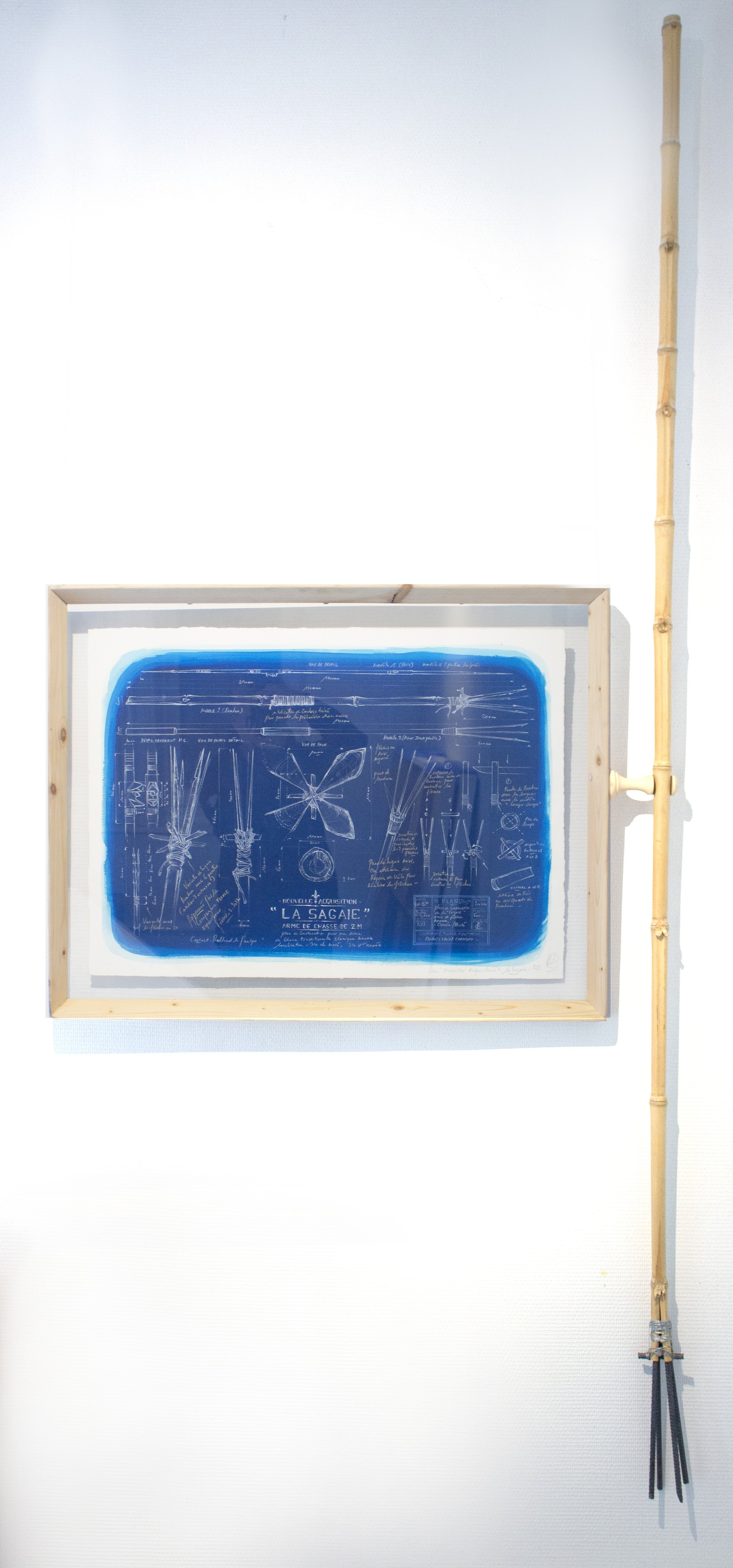 Prismalo on 300 gr Arches paper, ultramarine and turquoise blue ink, glass, wood frame, bamboo, rope, steal. 60 x 80 cm.