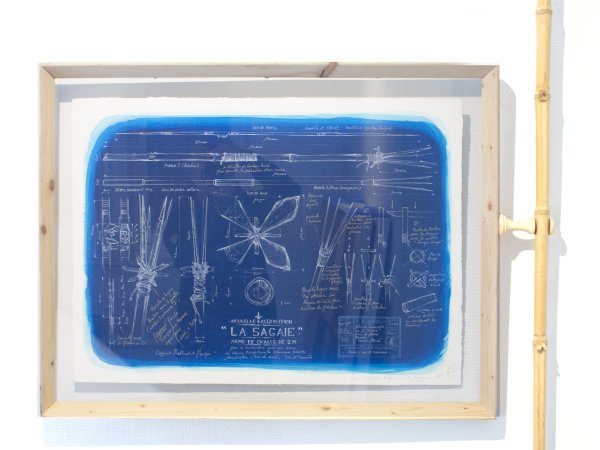 Prismalo sur papier Arches France 300gr, encre bleu outre mer et encre turquoise, verre, cadre bois, bambou, corde, acier. 60 x 80 cm.