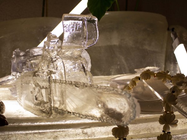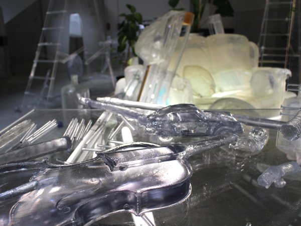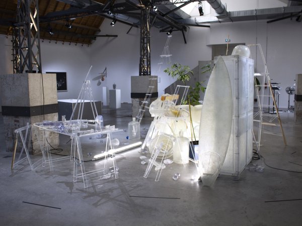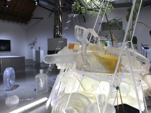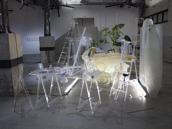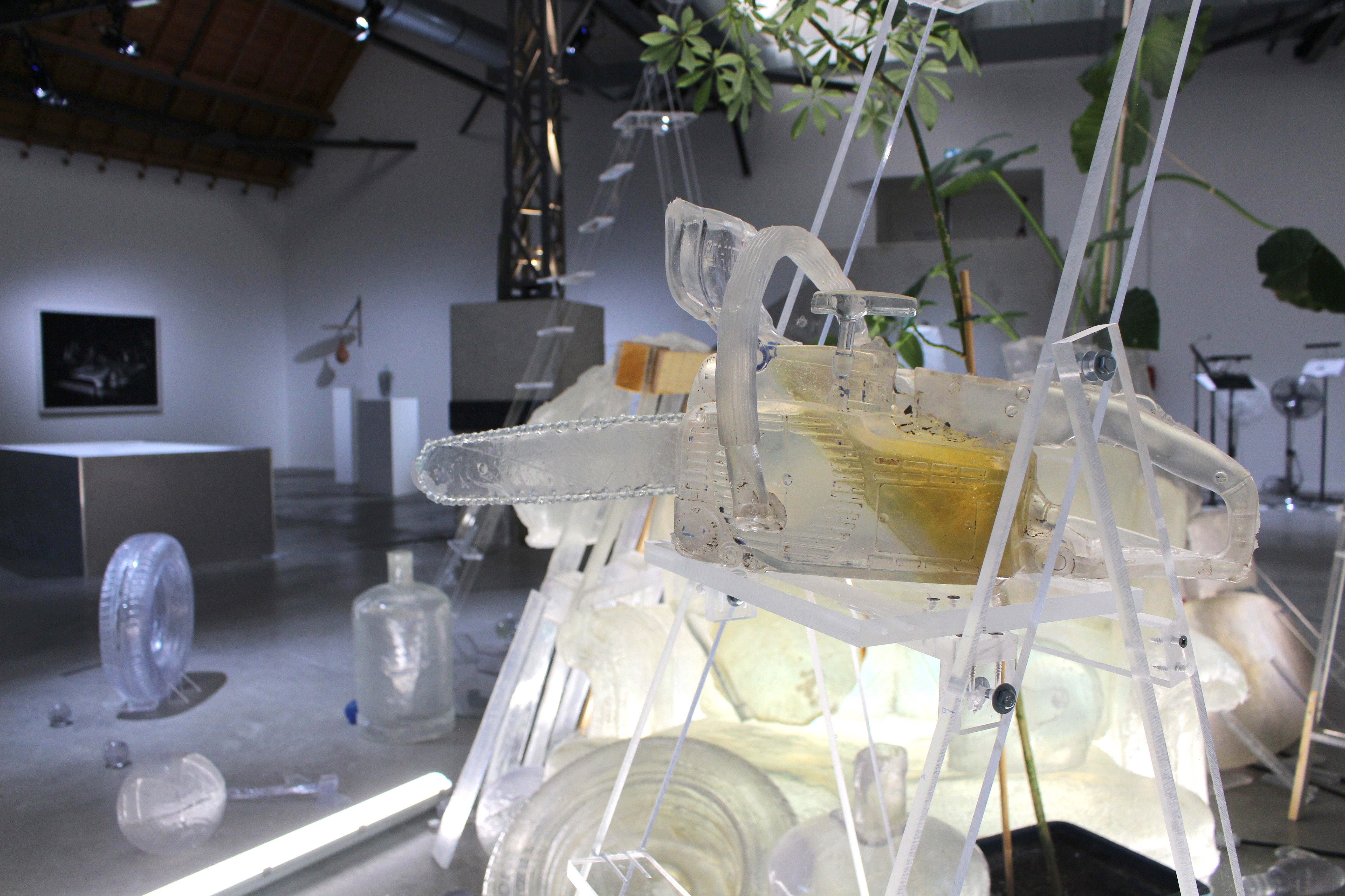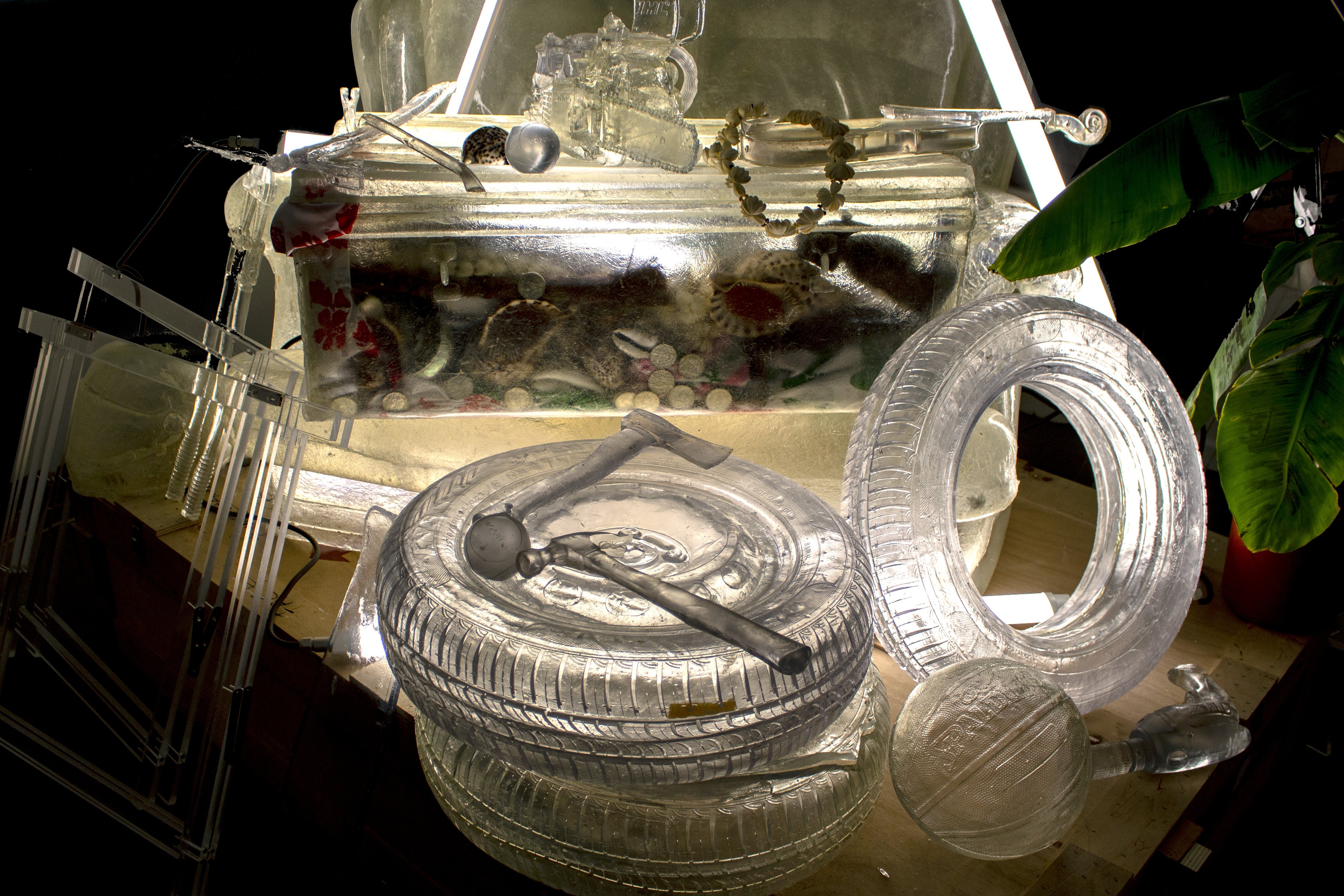 Acier, néons, résine transparente polyester, résine transparente epoxy, tissu de verre, gelcoat transparent, plantes, vernis haut brillant. Pièce unique.