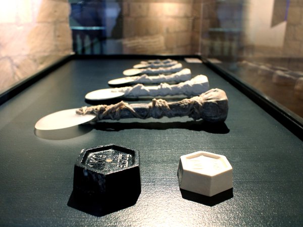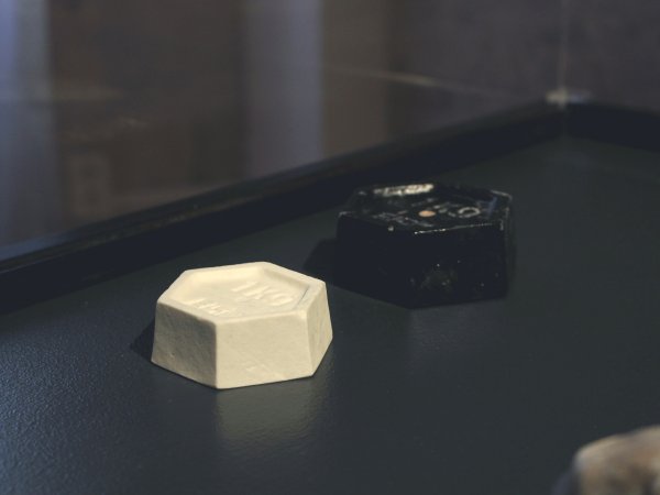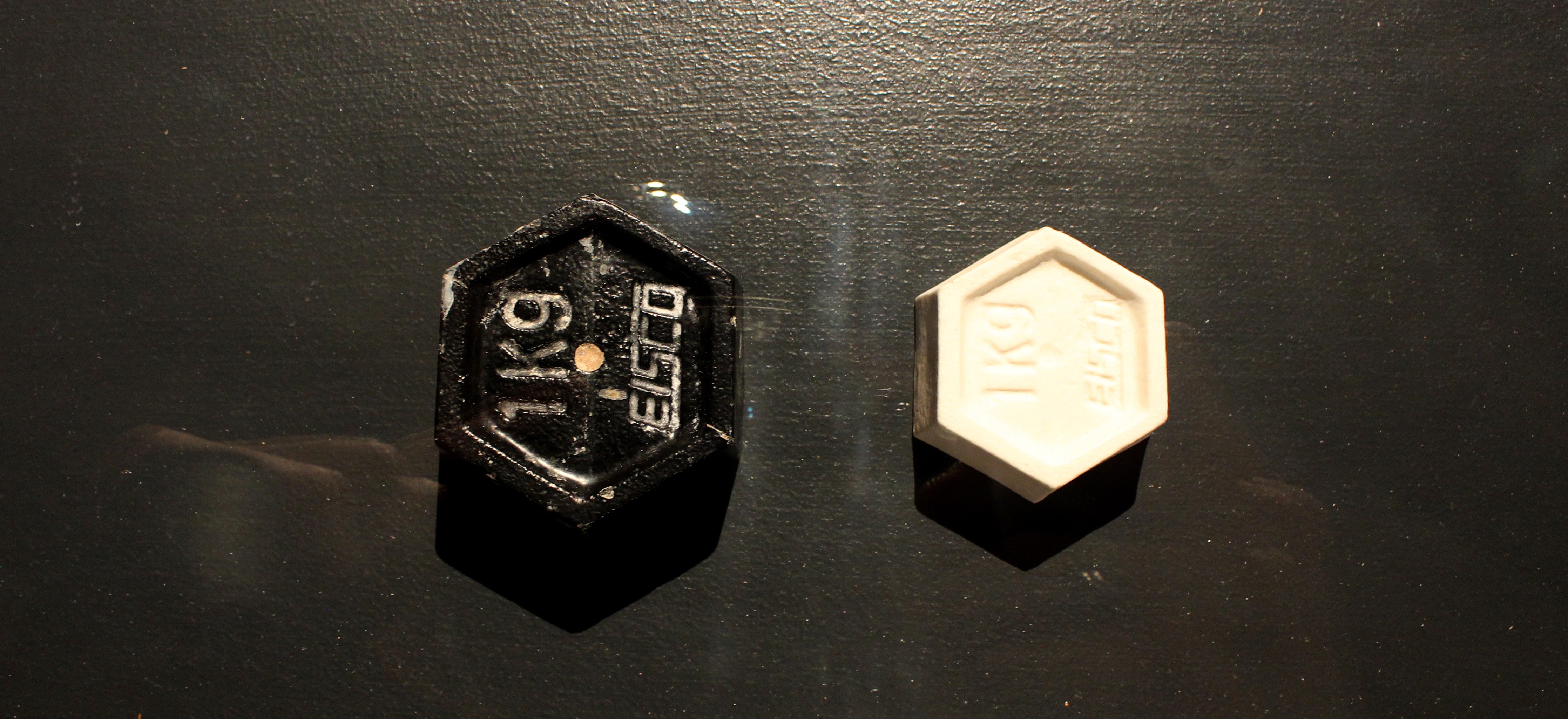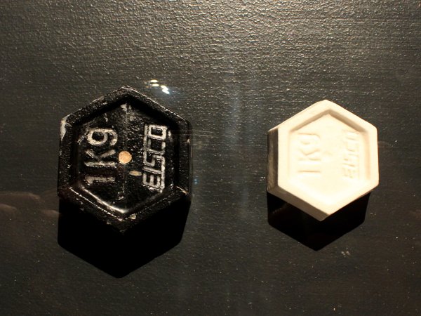 Premièrement un poid de 1 kg en fonte comme référent de taille et de volume.