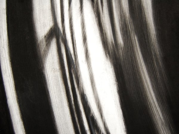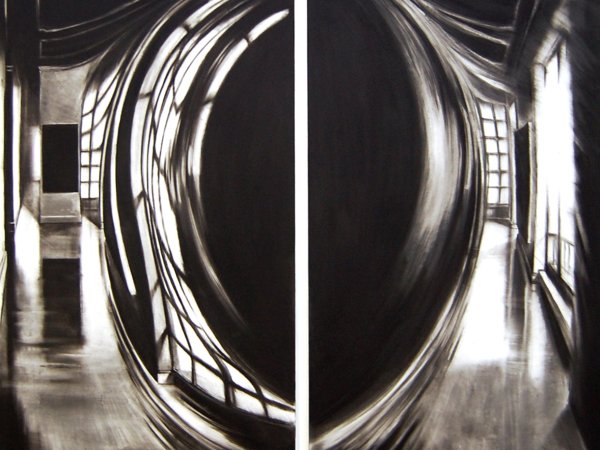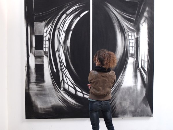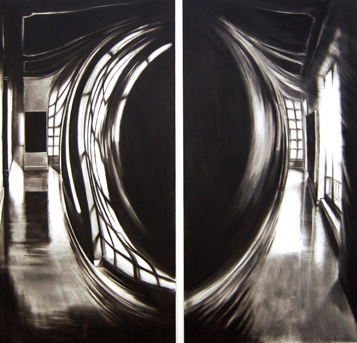 Charcoal, black stone and white highlights on monted paper ; 244 x 250 cm. Public collection