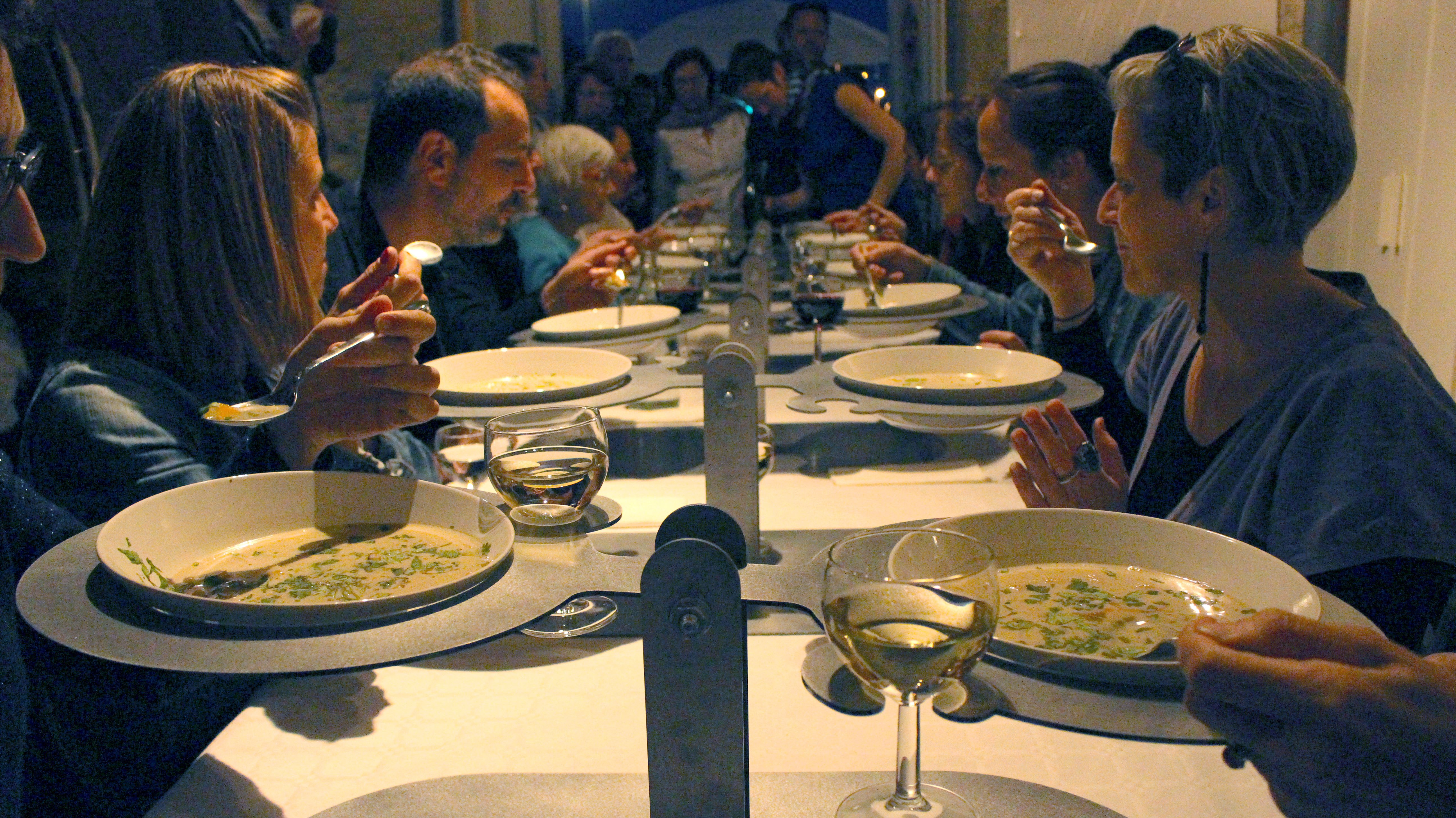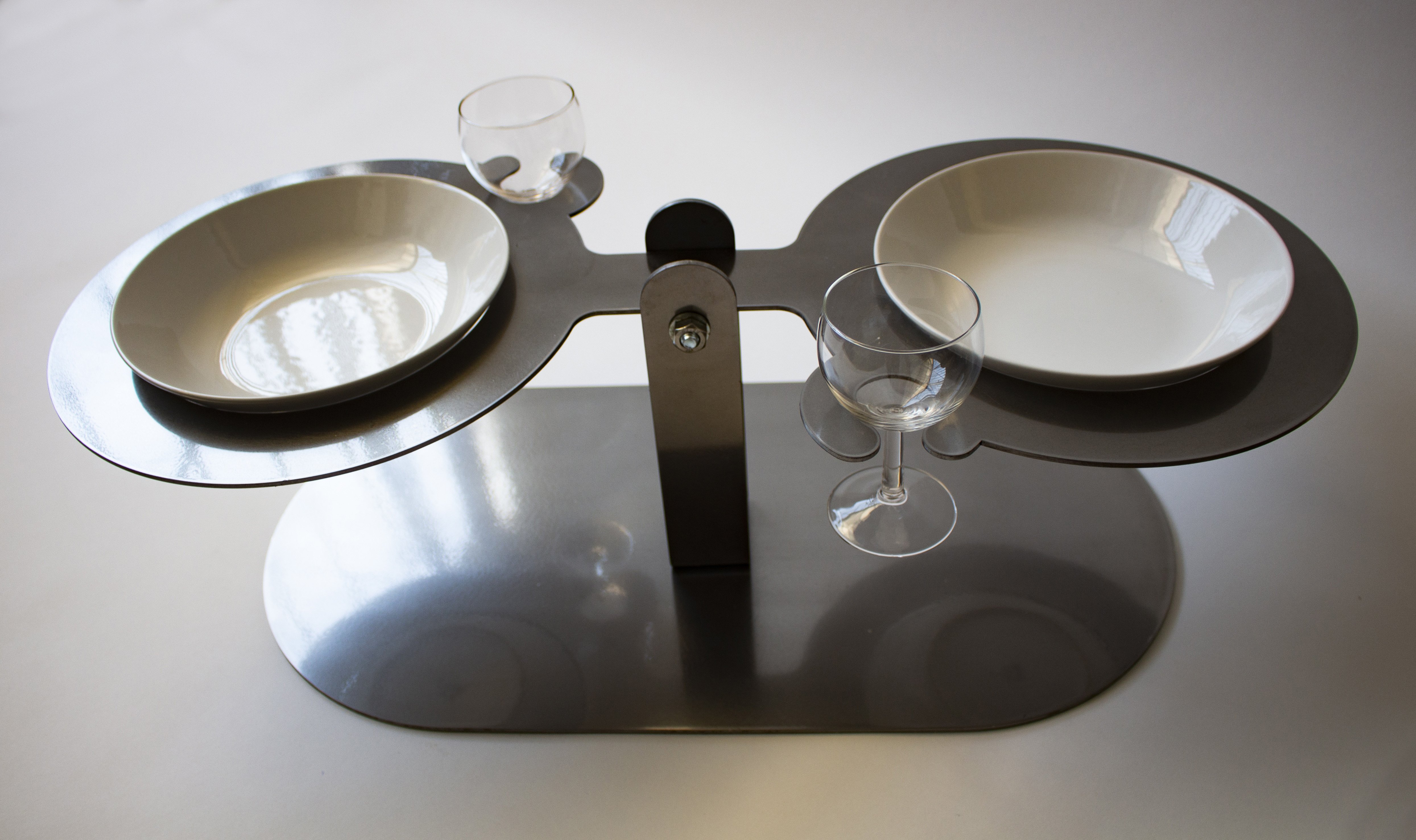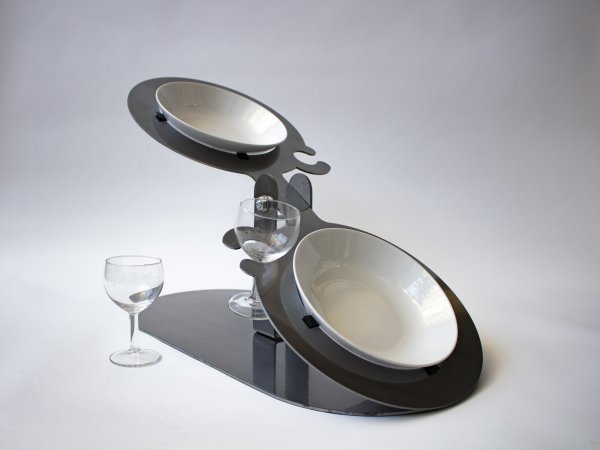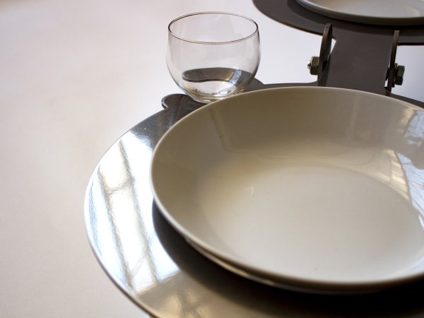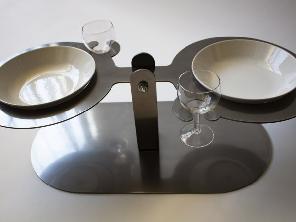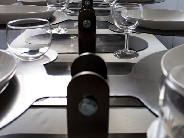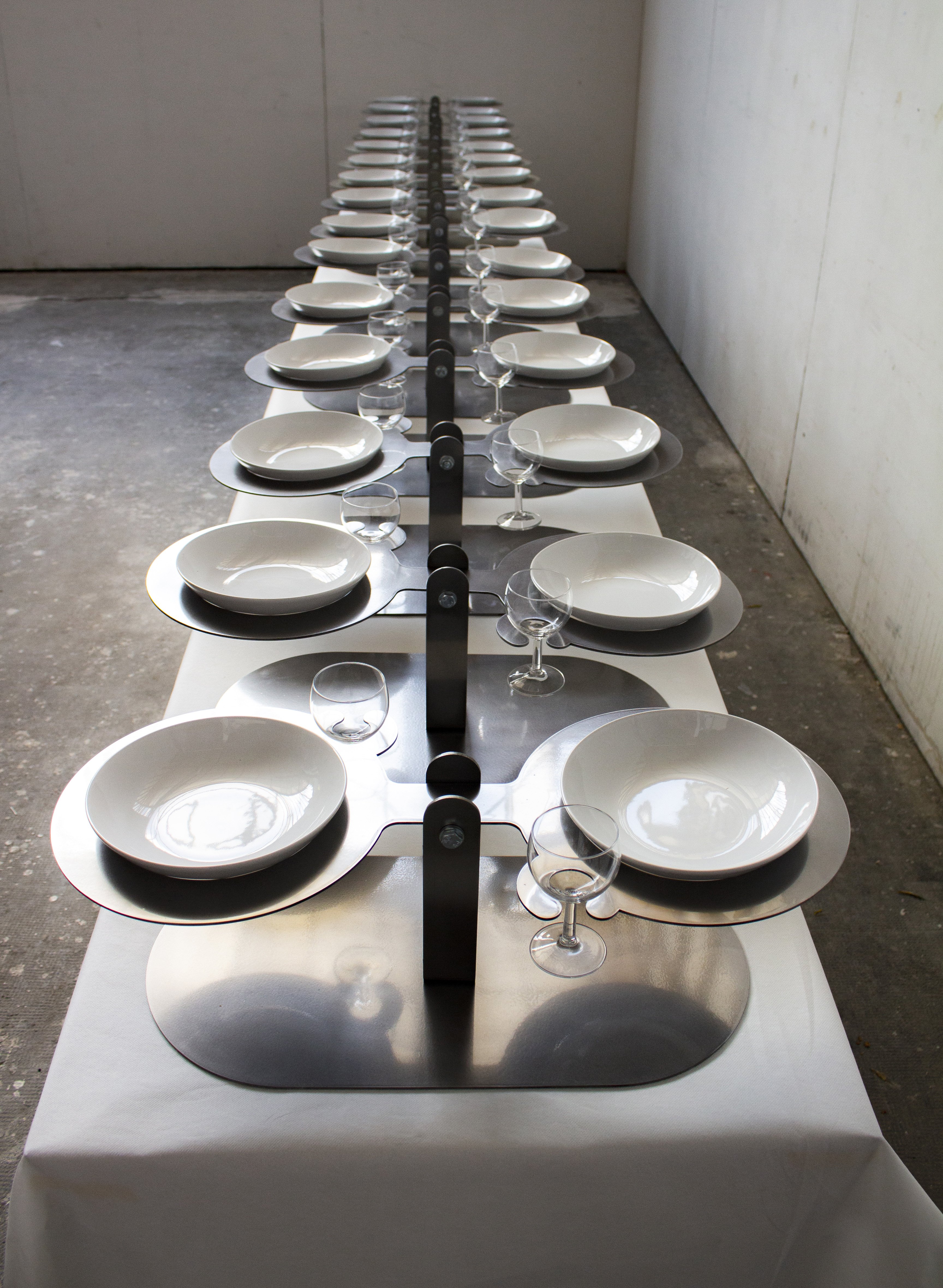 Acier découpé au laser, 32 verres, 32 assiettes en céramique, 32 cuillères, repas commandée à une cheffe cuisinière, 32 personnes.