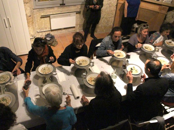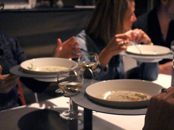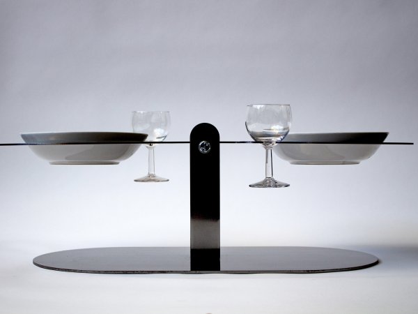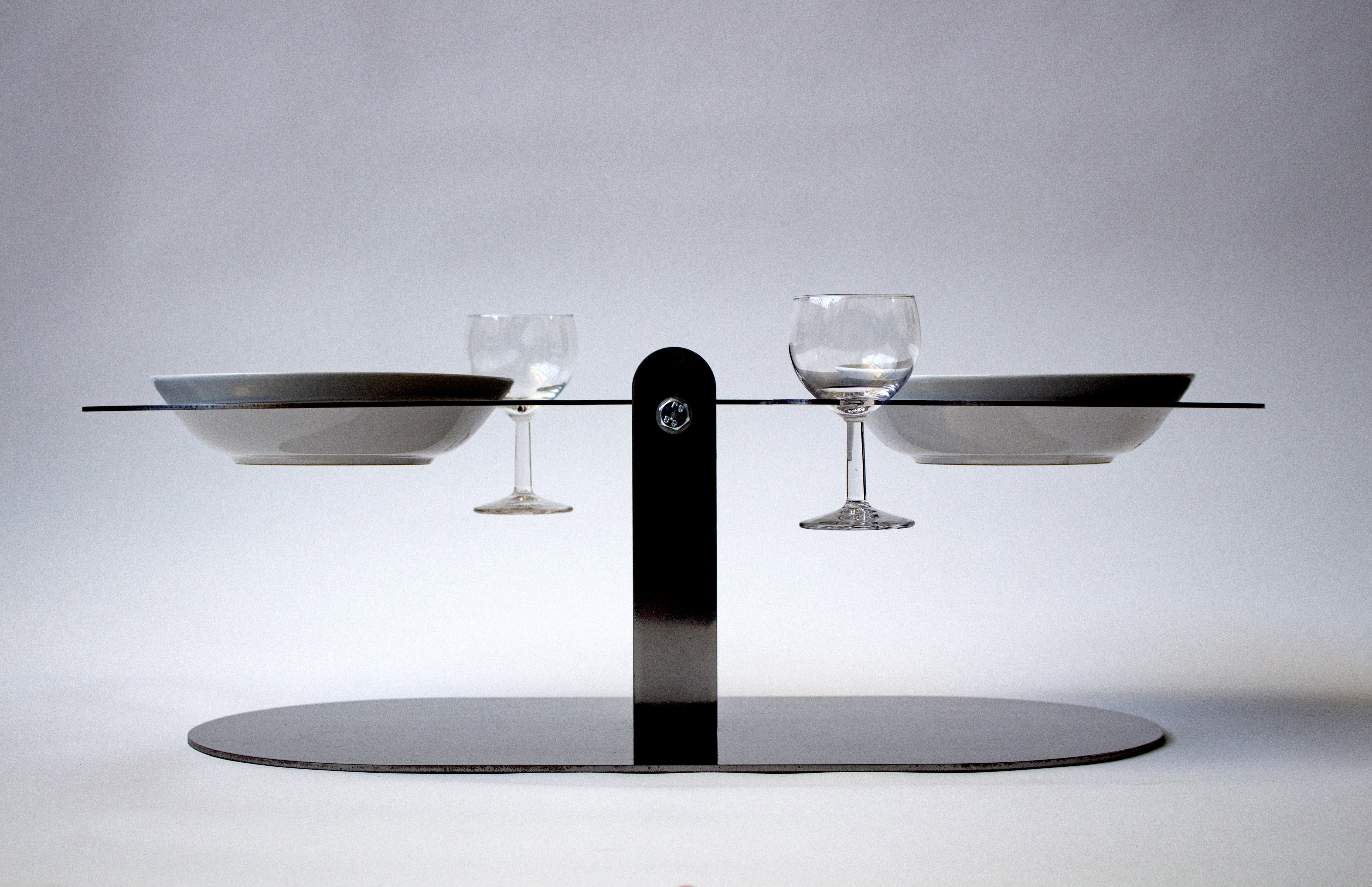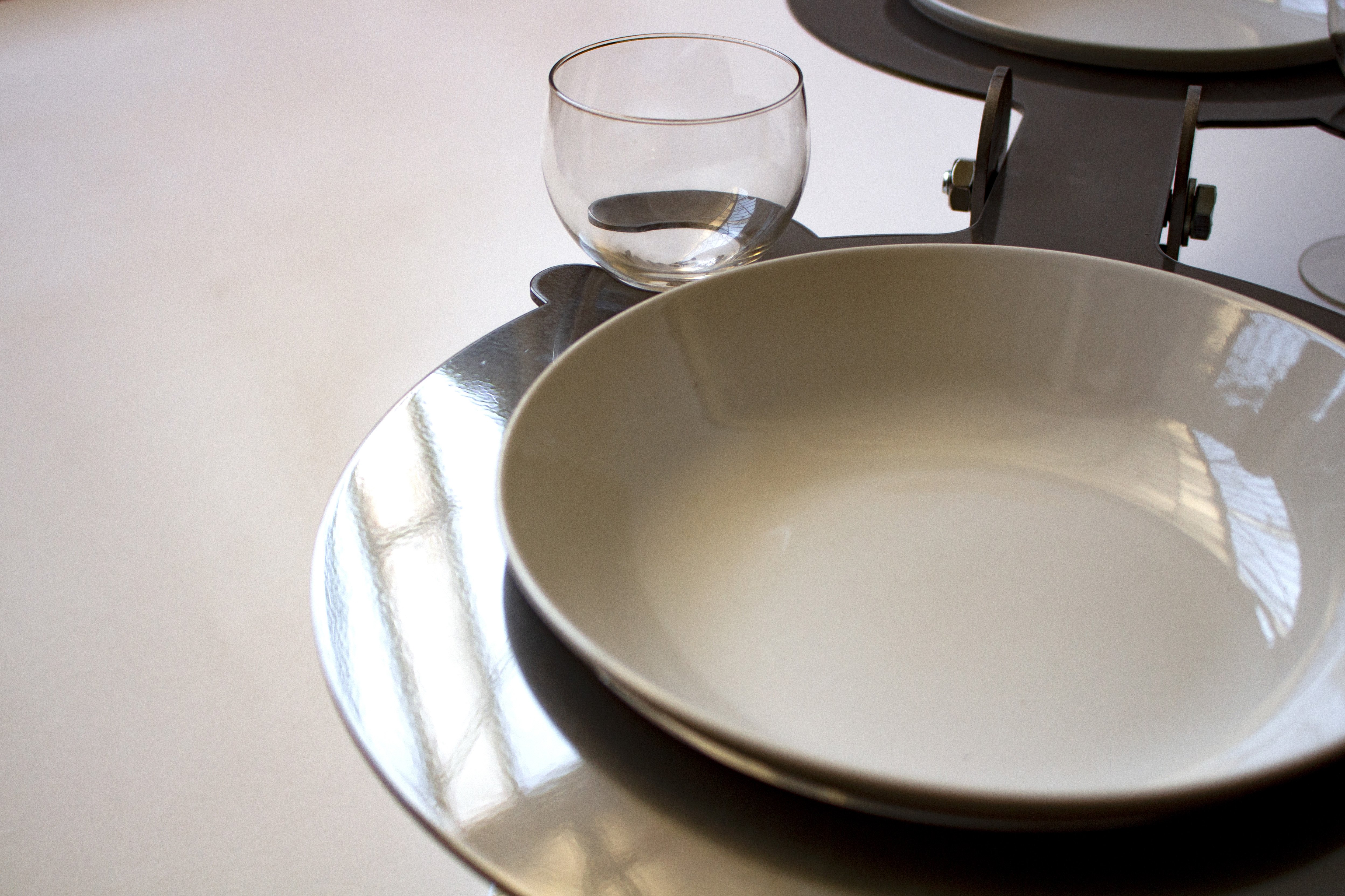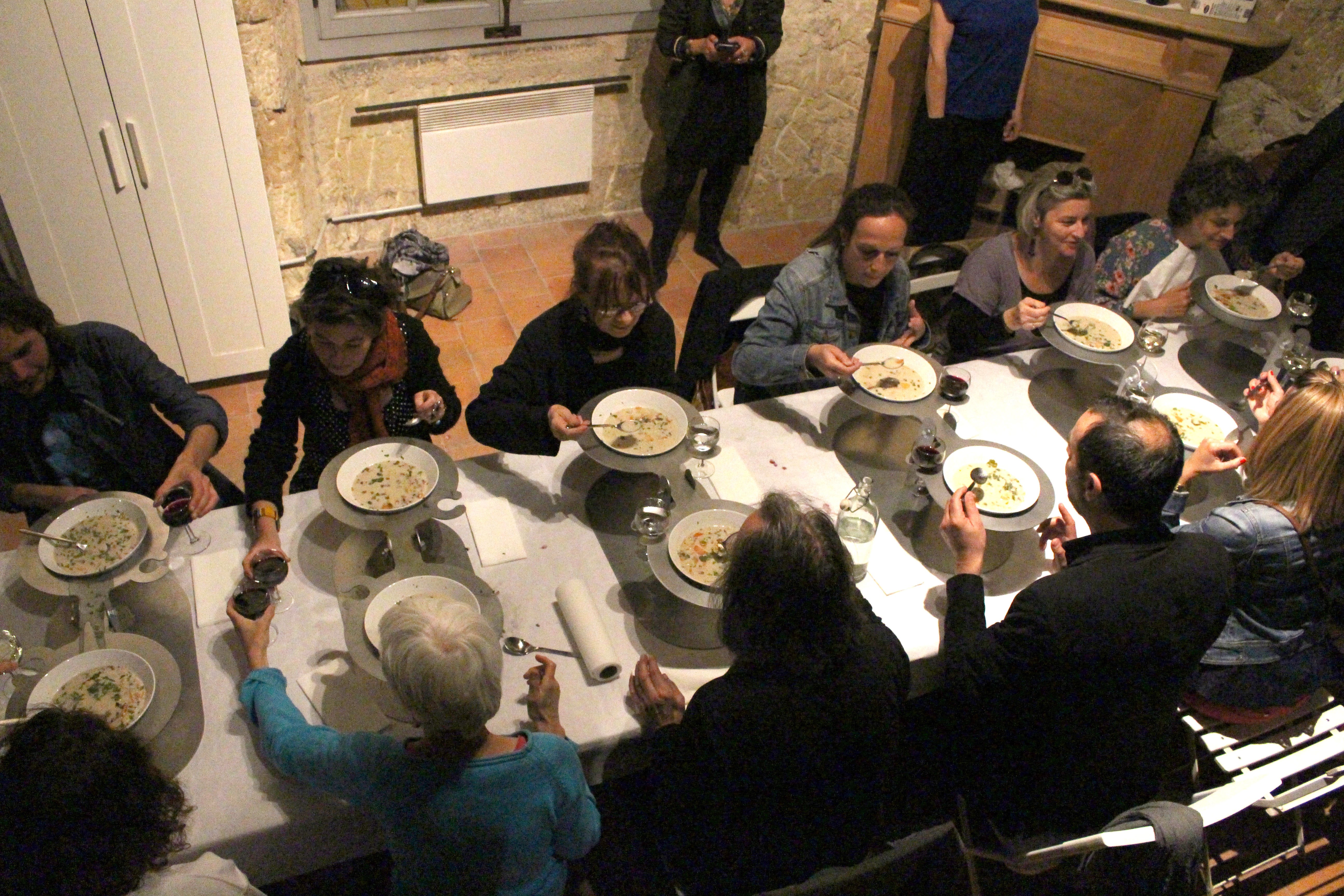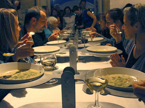 Acier découpé au laser, 32 verres, 32 assiettes en céramique, 32 cuillères, repas commandée à une cheffe cuisinière, 32 personnes.