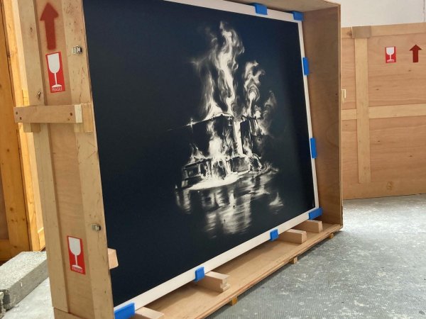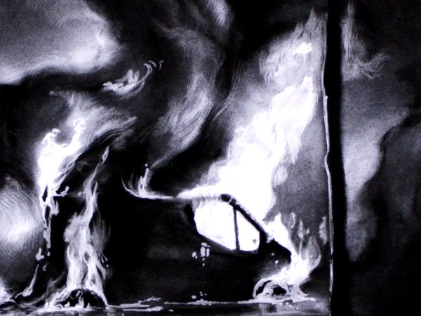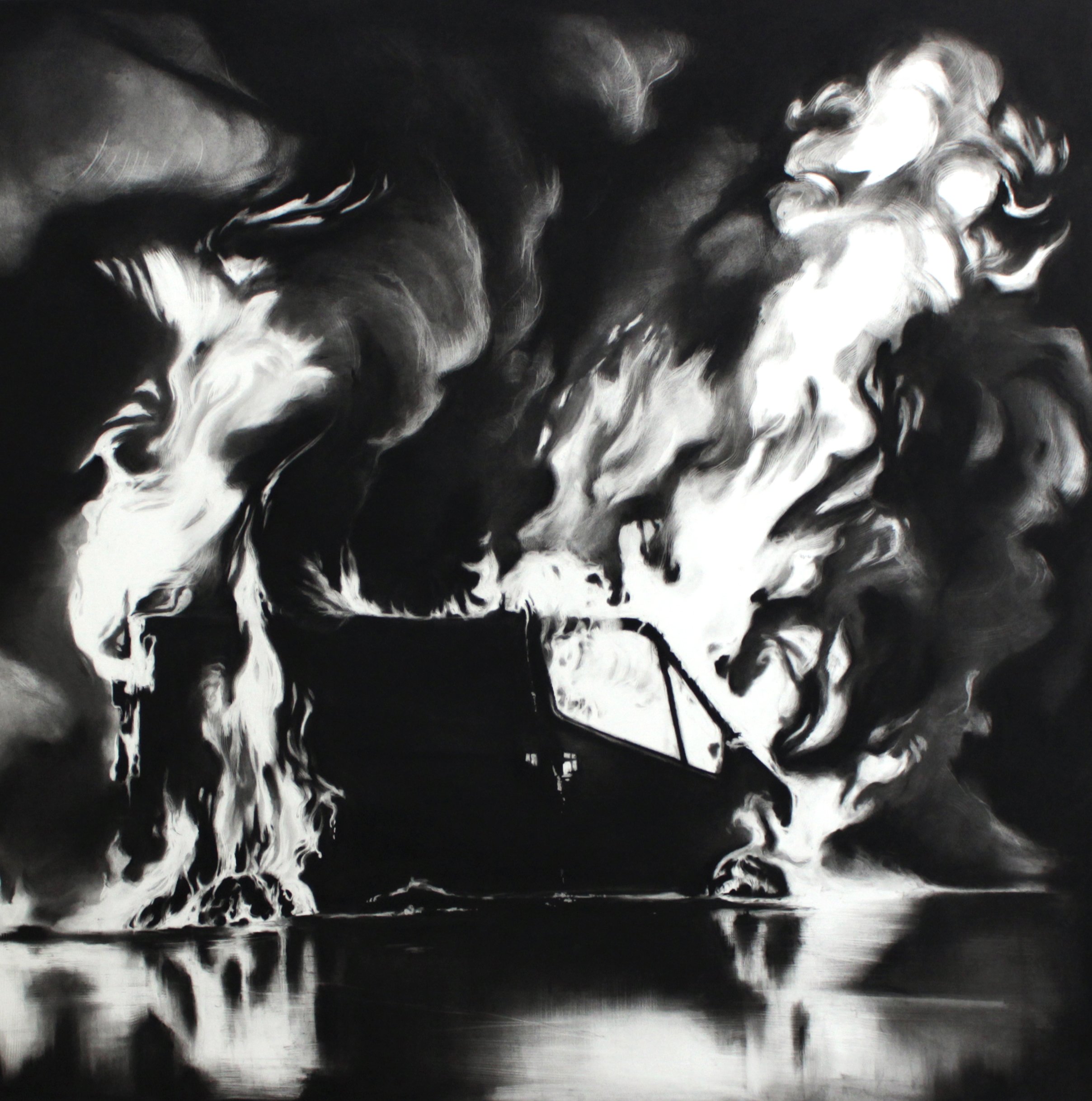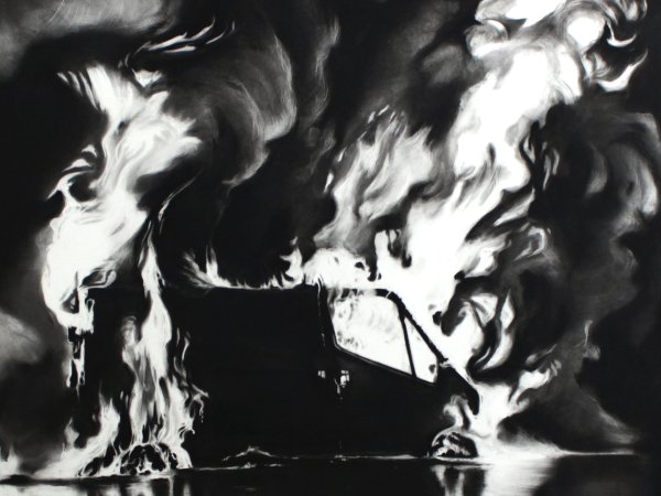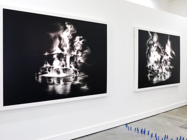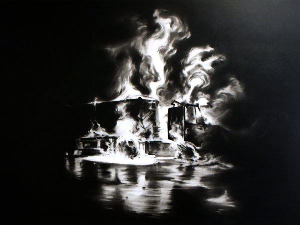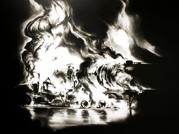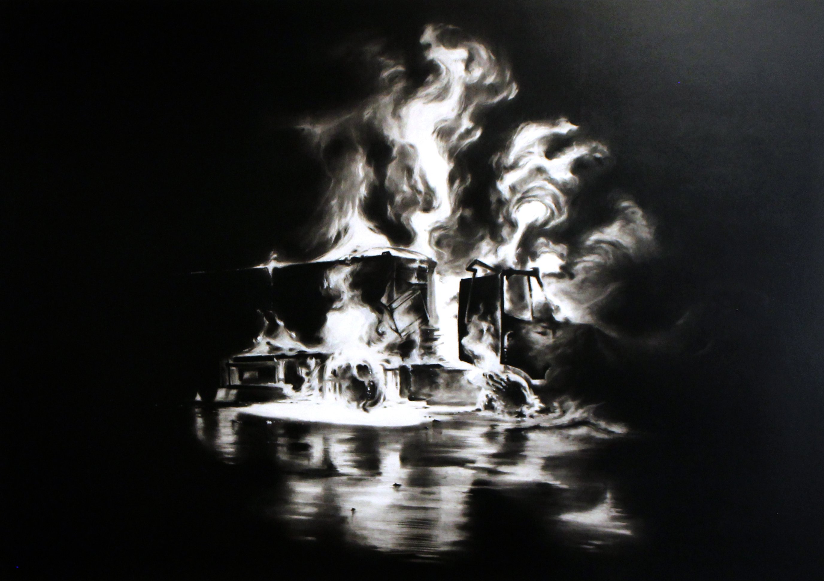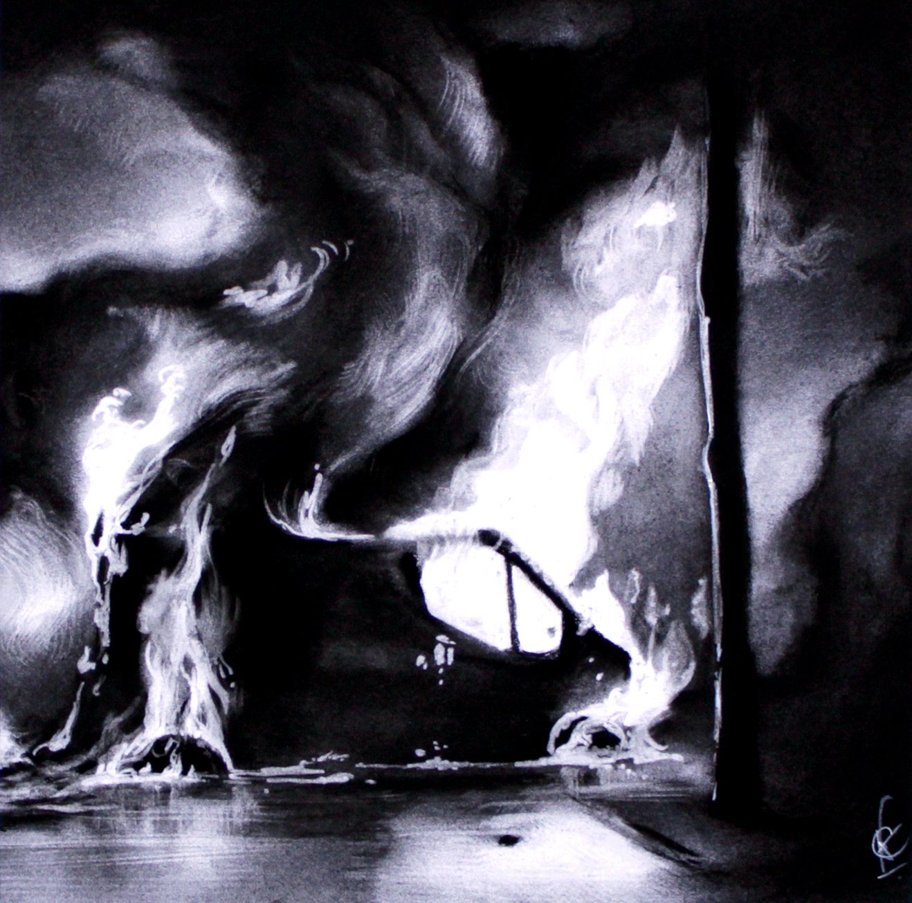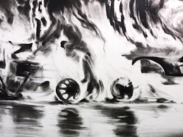 Ces deux dessins représentent des paysages urbains en proie à la violence. On y perçoit des véhicules en feu : un semi-remorque et un camion-citerne. Comme habituellement dans la pratique de François Xavier Chanioux, le mouvement habite le dessin. À la fois hyperréalistes et pourtant réalisés en aplats noirs avec de rares rehauts de blanc, ces deux œuvrent nous font valser entre la fiction et la réalité. Est-ce des images réelles issues de l’actualité ? Ou l’image d’un scénario mental sensible et fictif tout droit sorti de mon imagination ? Ici, François Xavier Chanioux nous met face à des images familières, que nous aurions pu consulter dans l’actualité, peu importe le support : presse écrite, journaux télévisés, fil d’actualité des réseaux-sociaux, etc.
