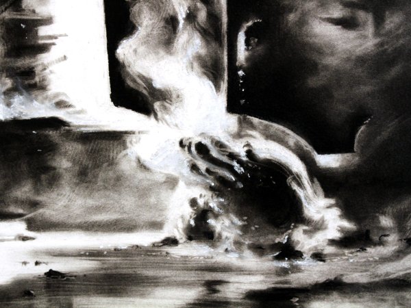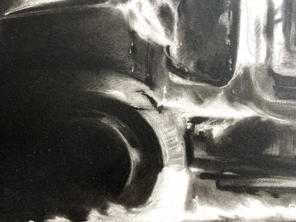 Charcoal, black stone and white highlights on monted paper. 66 x 48 inches.