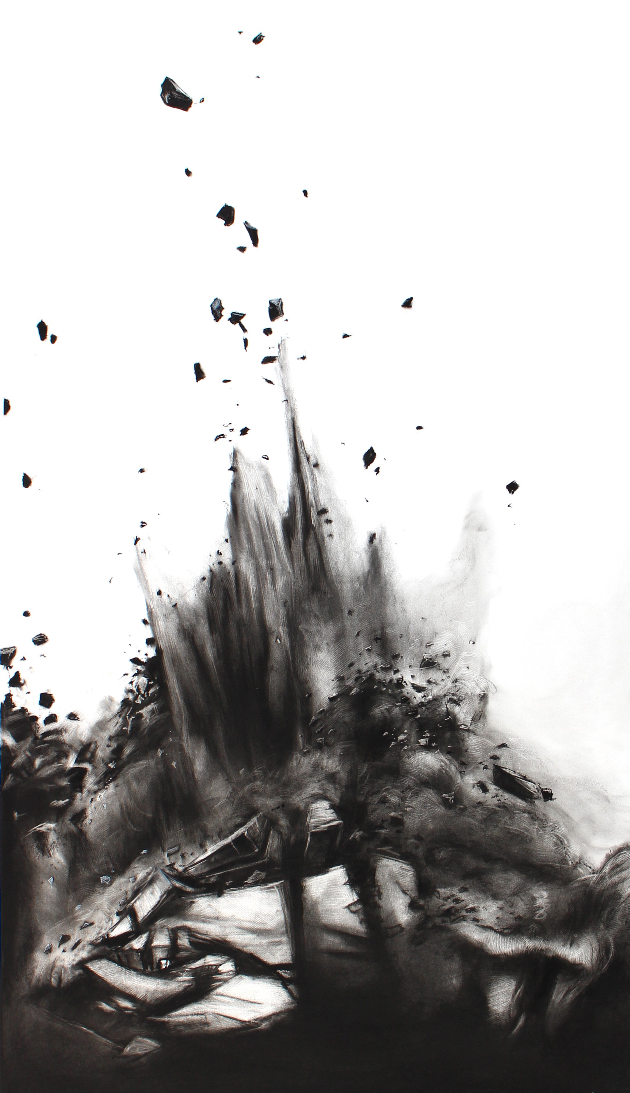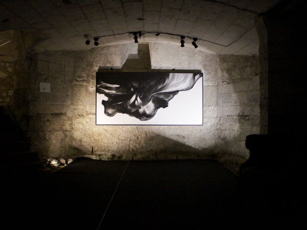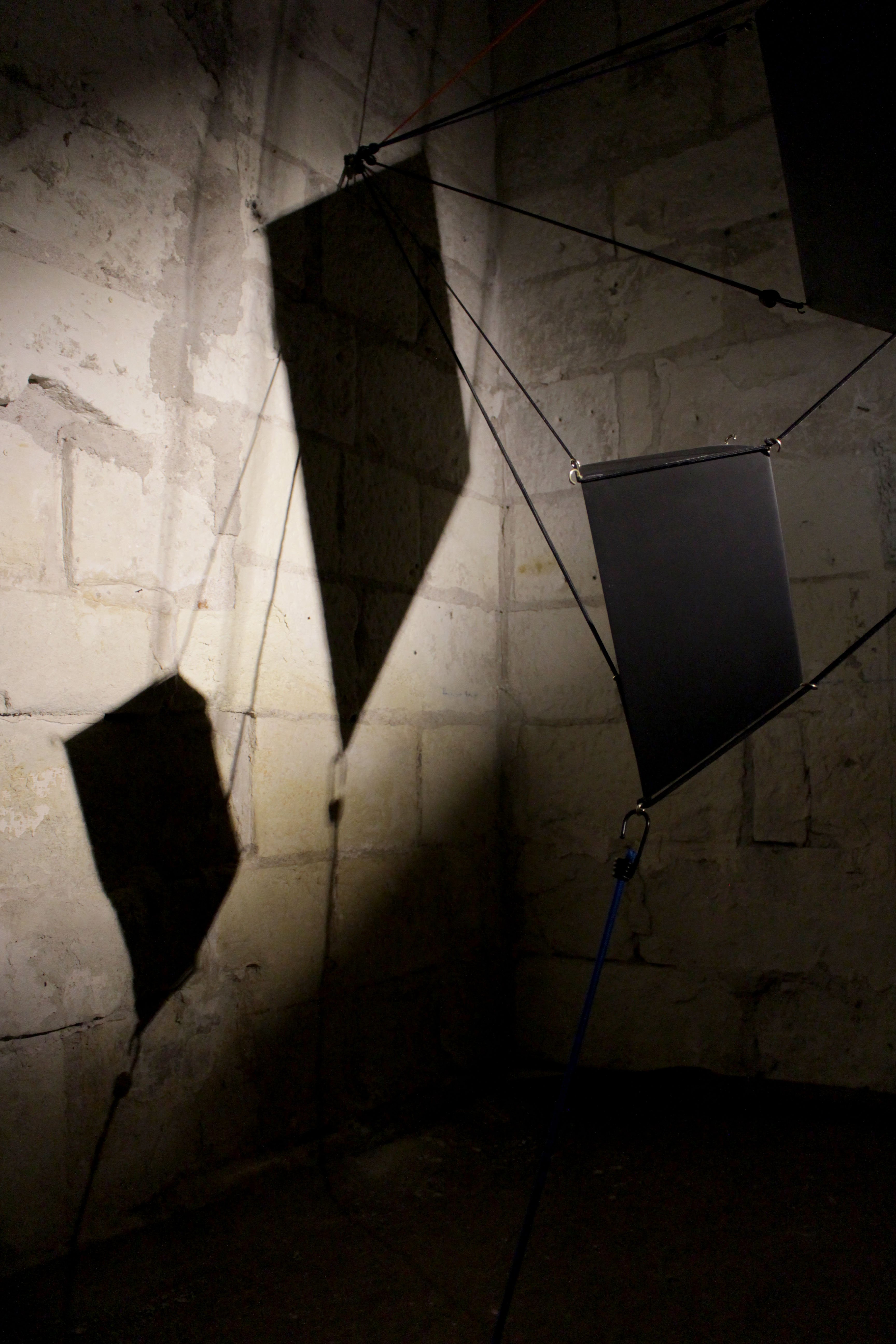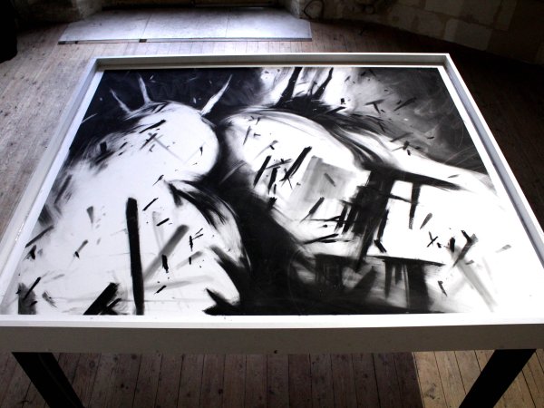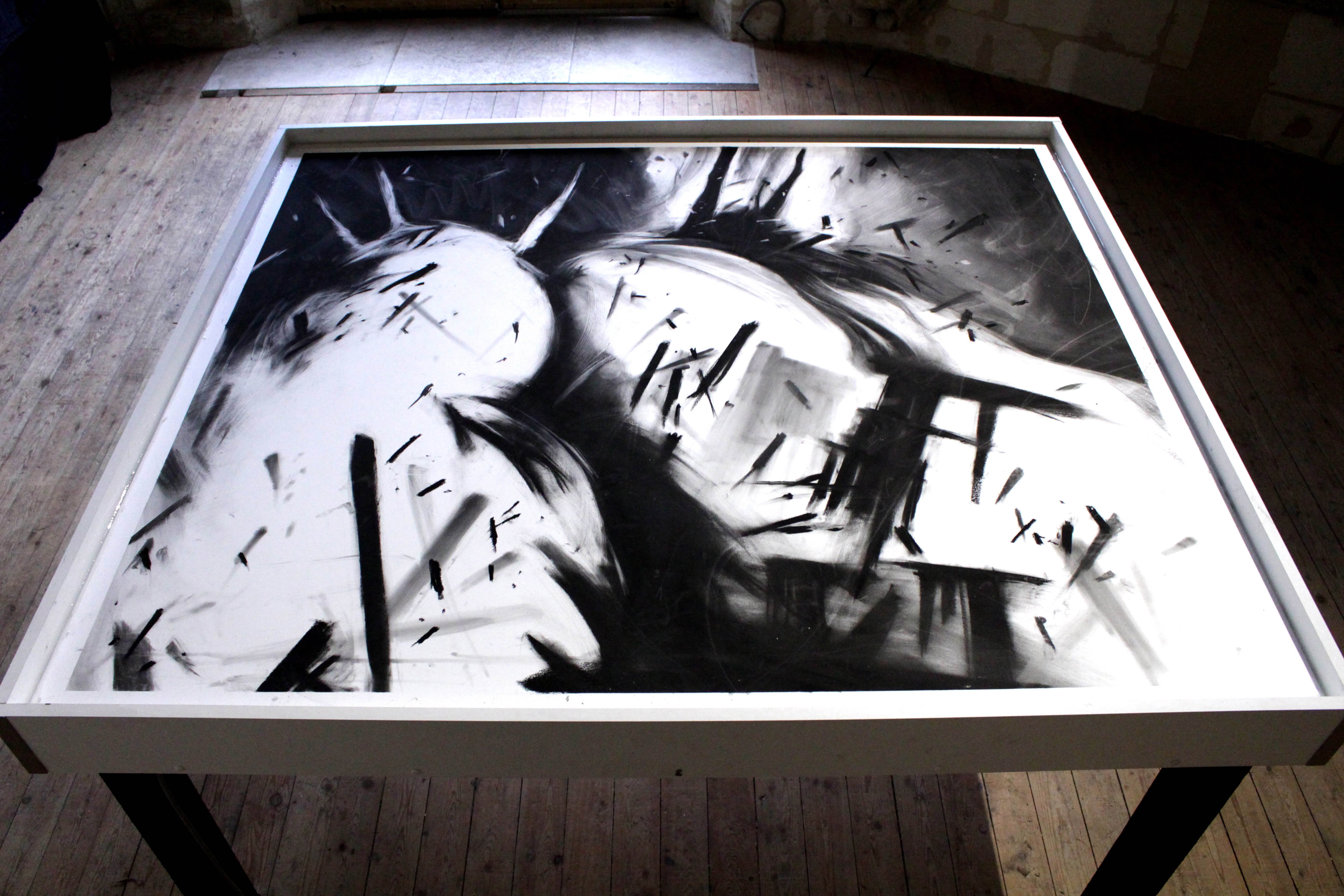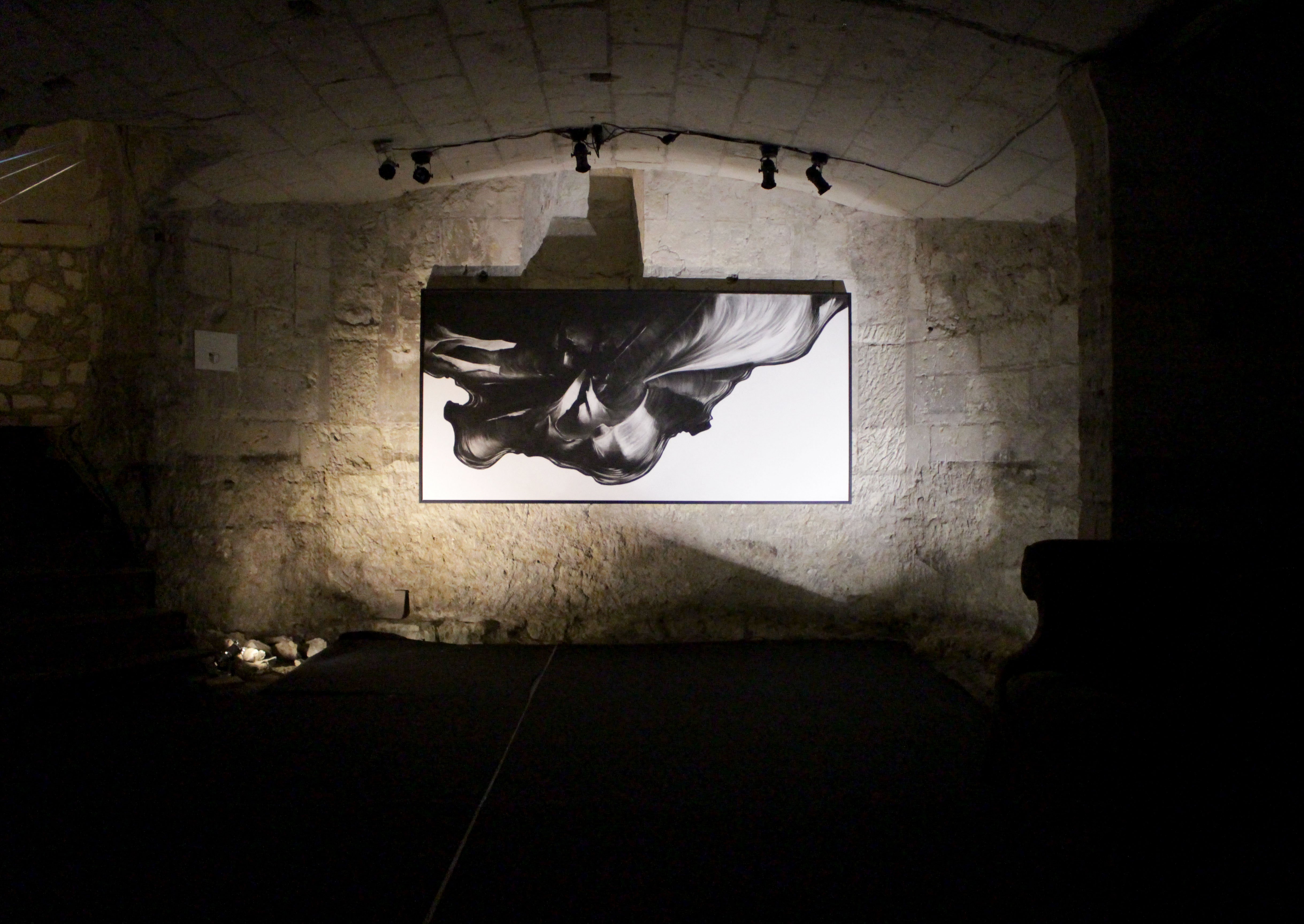 Exposée dans l’espace de 300 m2 sur quatre niveaux, l’exposition présente exclusivement des œuvres in-situ. Scindée en plusieurs espaces, la proposition se déroule à l’image de la pellicule d’un film. Chaque espace de la Chapelle, présente une pièce spécifique et interroge précisément un pan de l’œuvre dessinée. La proposition plastique est repartie en plusieurs axes de recherche et explore les notions de mouvements, du cinéma, de littérature, de narration, de perception et de réalité en construction.