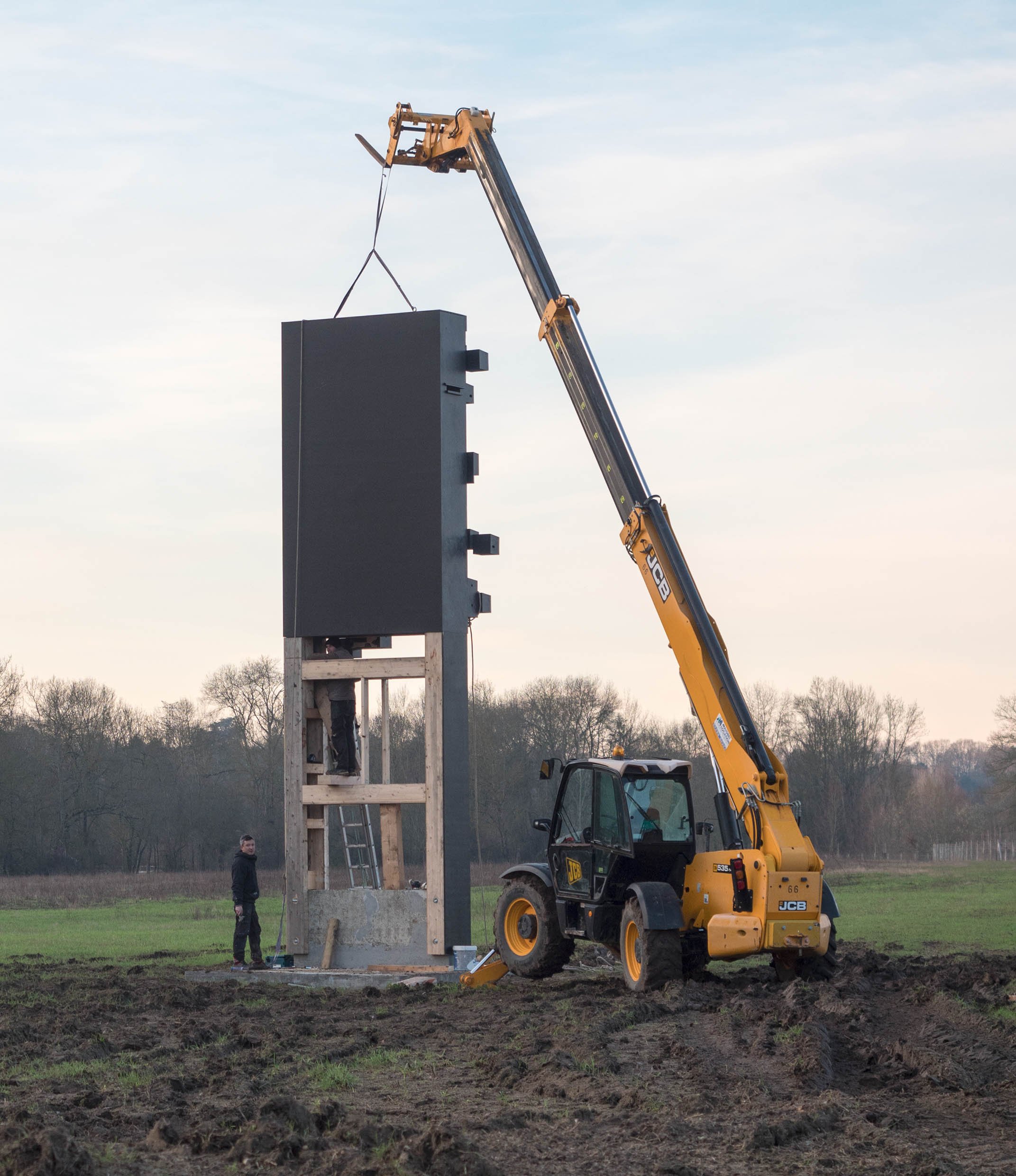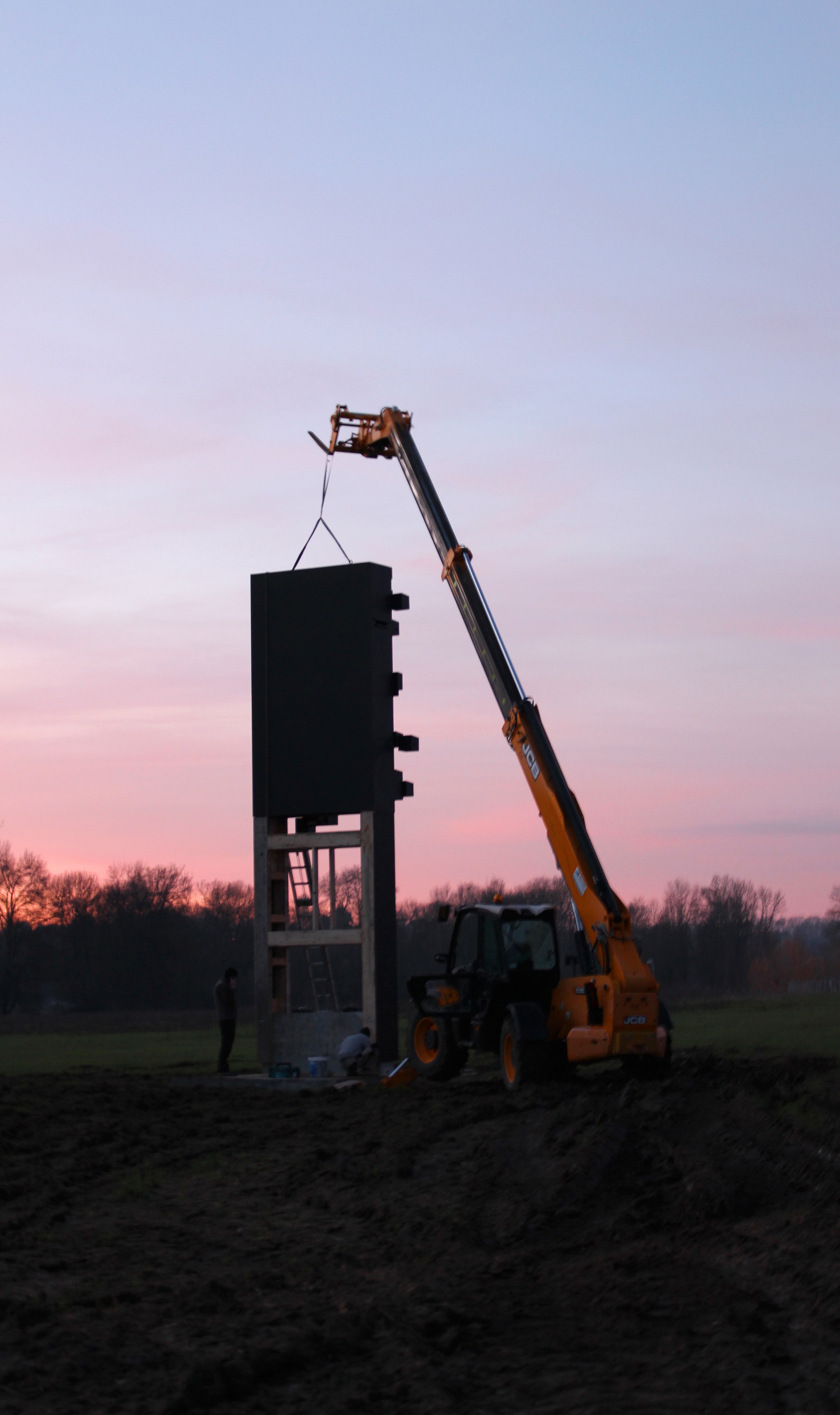 À dimension tant artistique que naturaliste, ma proposition Carbon Shelter prend la forme d’une sculpture monumentale de 8m20 situé dans l’ENS du Val de la Choisille en Indre et Loire. Cette sculpture est le fruit de la collaboration avec des chiroptérologues , naturalistes, ornithologues, ingénieurs et artisants. À la frontière de la botanique, de l’architecture, du design, du champs de l’art contemporain et des Arts appliqués, le monolithe noir mat manifeste une radicalité plastique sobre et imposante ainsi q’une ingénierie naturaliste pour la préservation d’une biodiversité donné. L’emploi des matériaux, les dimensions, la couleur, l’emplacement, l’orientation ont été déterminés par les nombreuses expertises effectués auprès des spécialistes concernés.