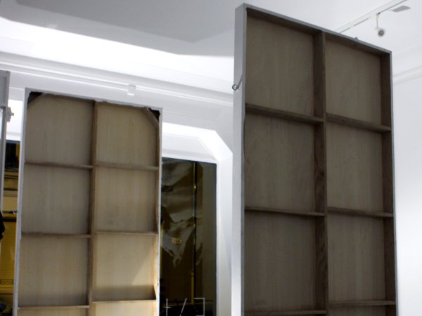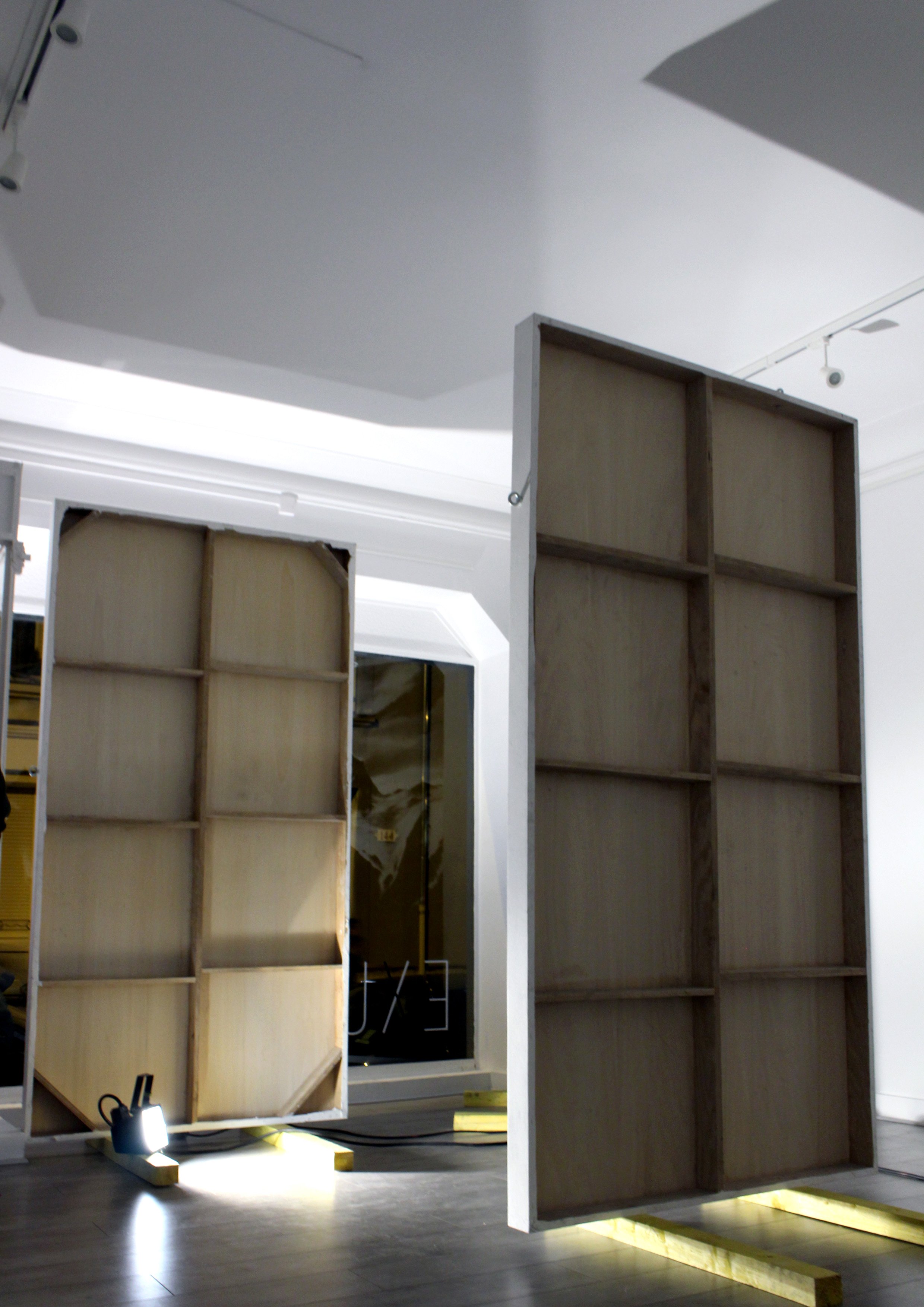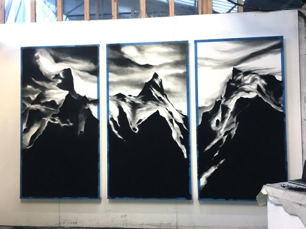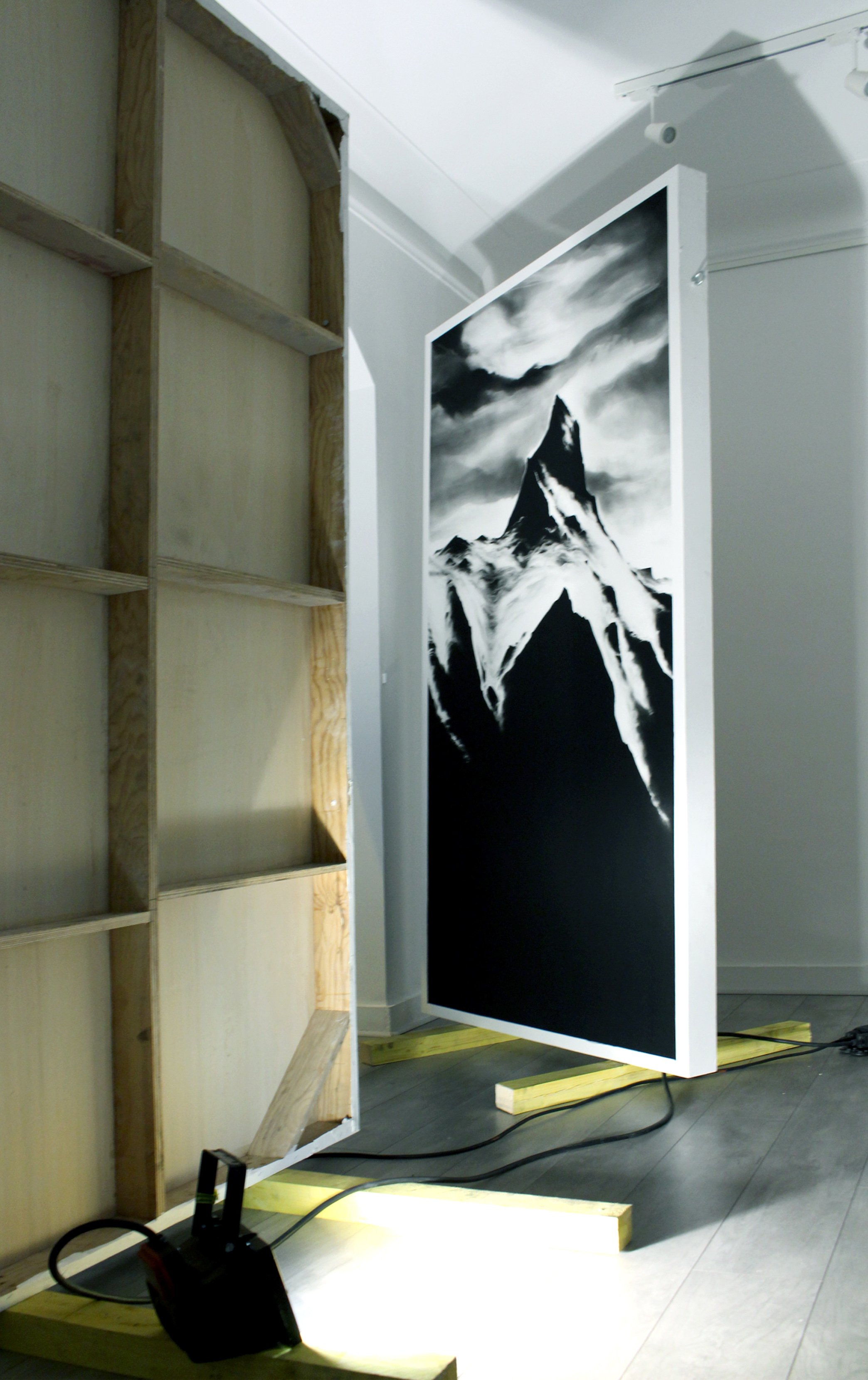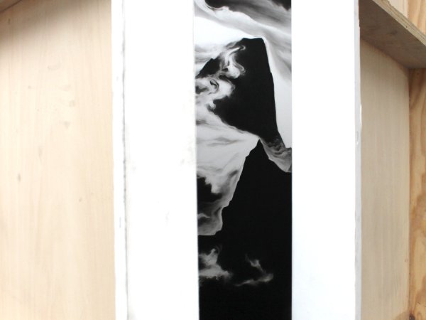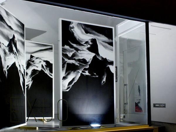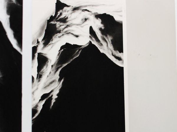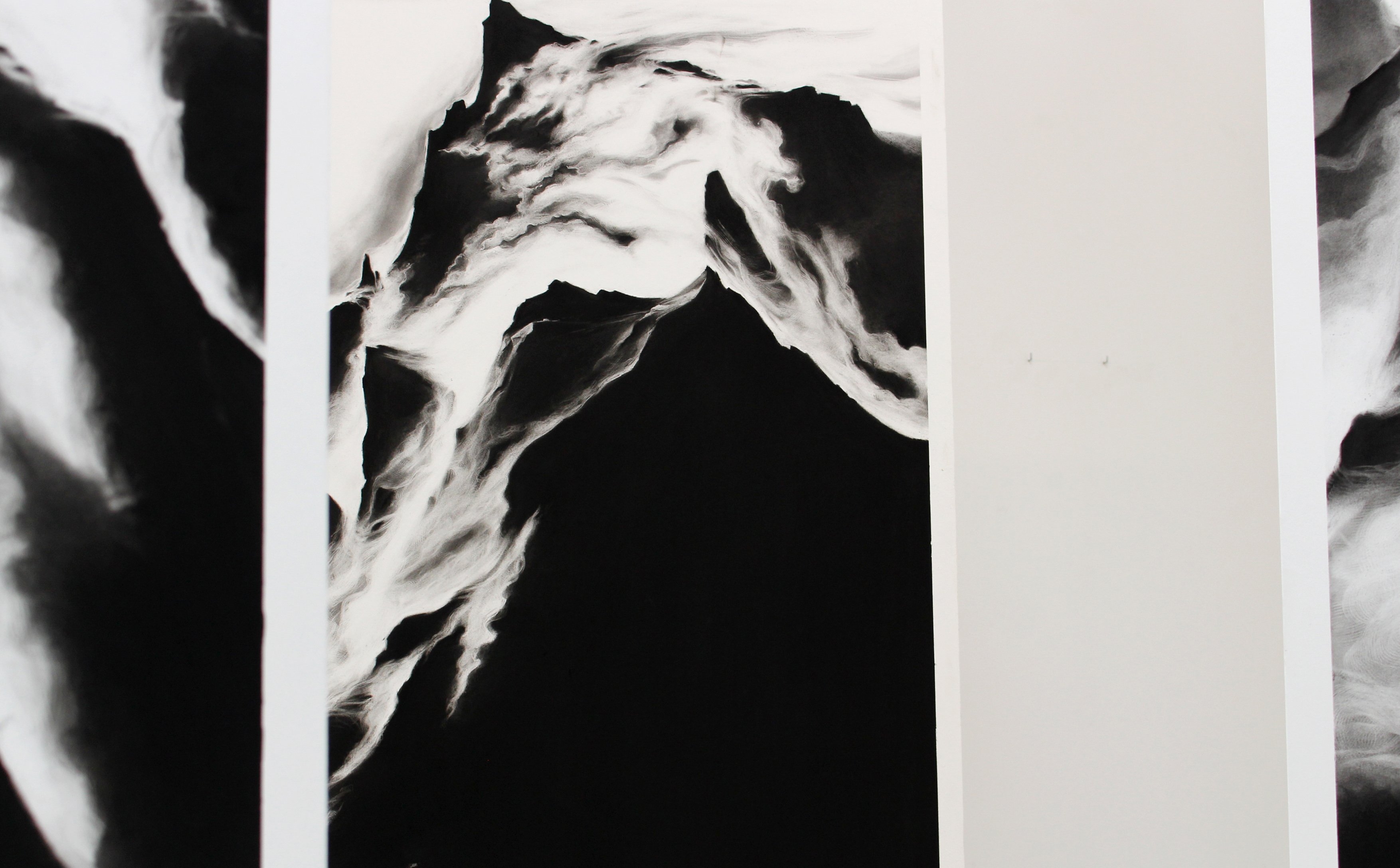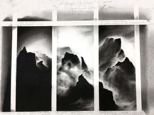 Invité à investir la galerie Exuo, ma proposition était de présenter des fusains de grands formats en qualité de sculptures. Posé directement au sol, le triptyque se veut imposant, à l’image d’une parois infranchissable. Pour accentuer la stature monumentale des œuvres, une très large proportion du tableau est recouverte intégralement de noir uniforme. Tel des colosses, les dessins érigés à la verticale, s’obstruent mutuellement et entravent la visibilité de la Galerie.
