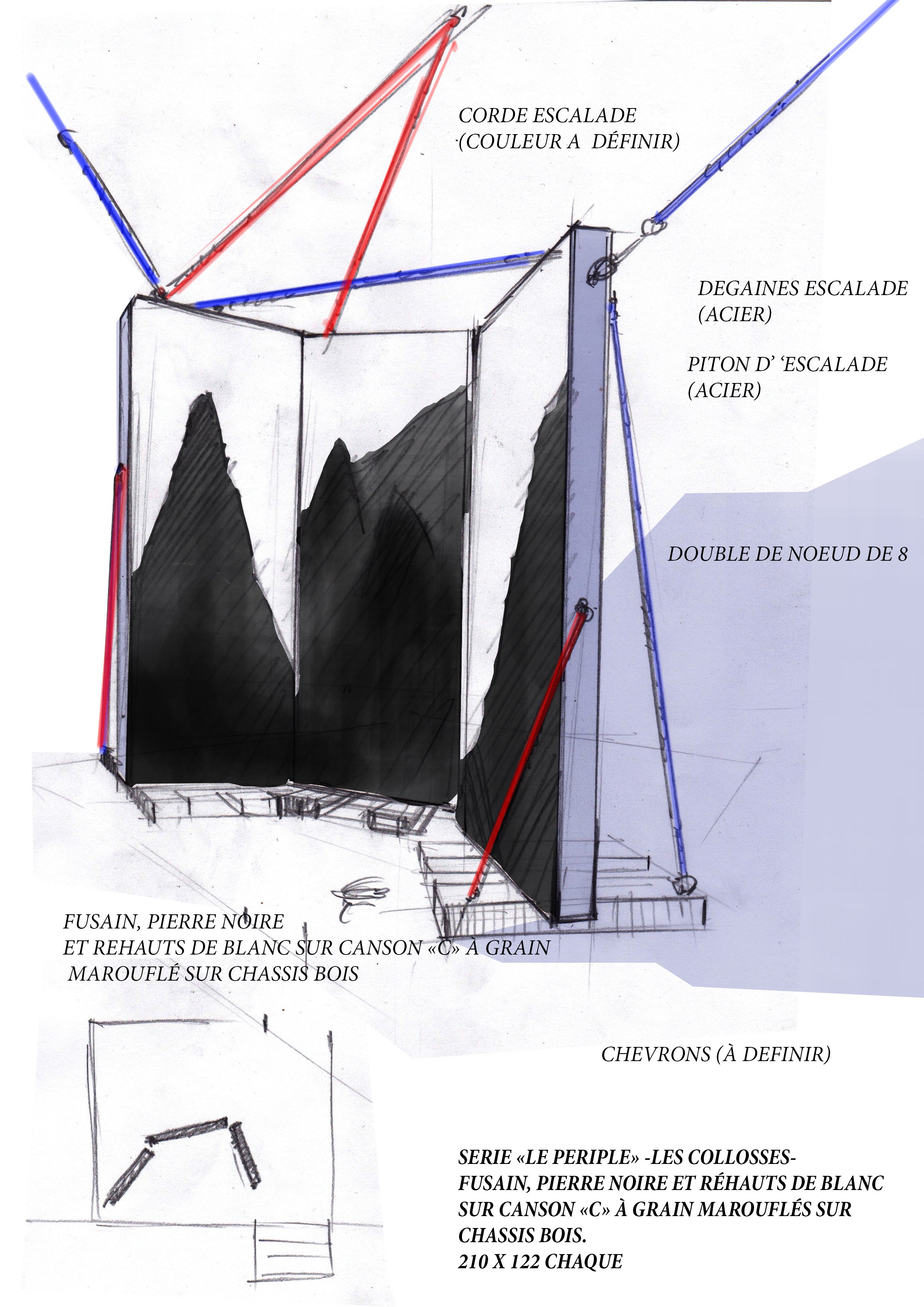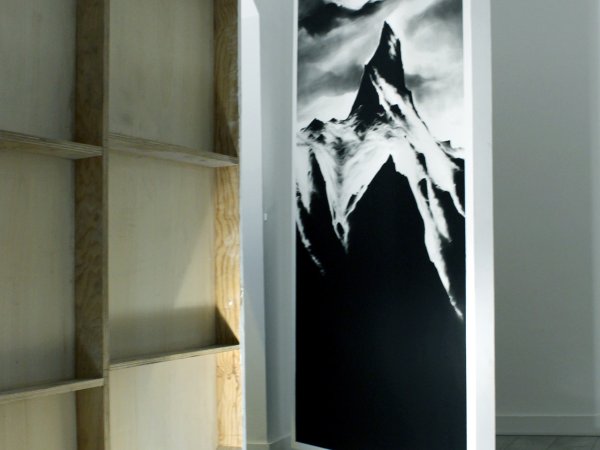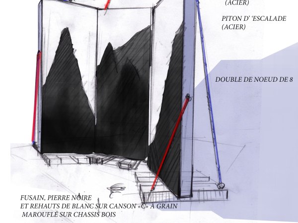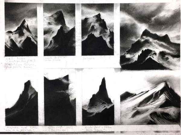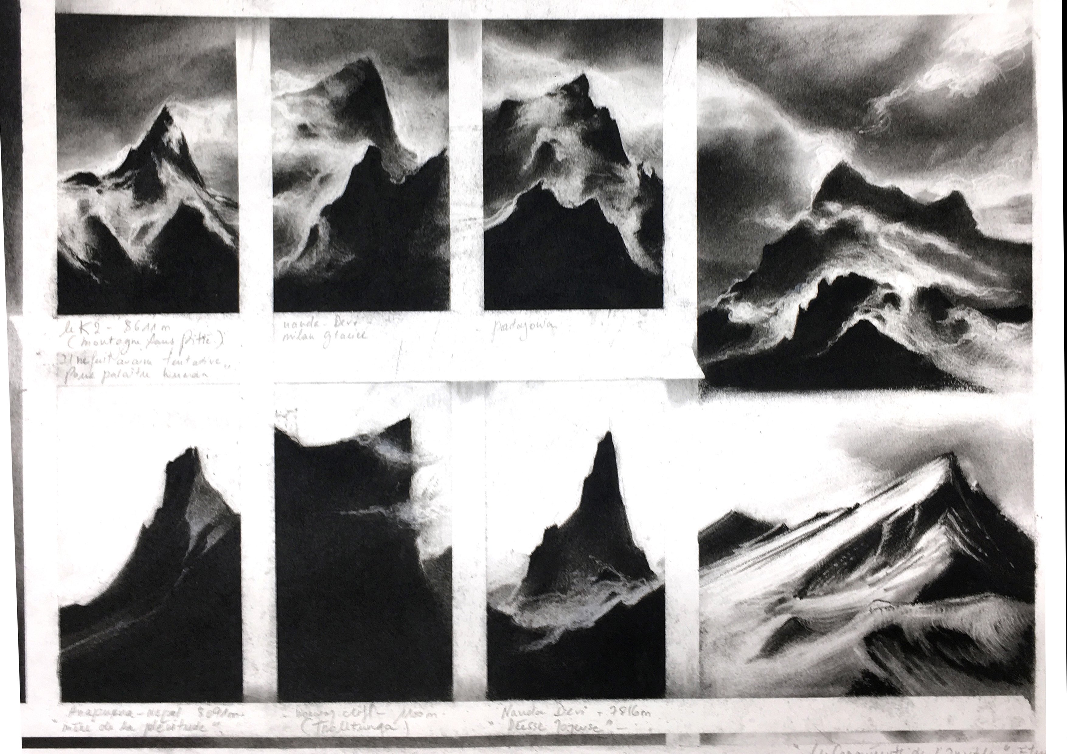 Extraits au Mont Analogue de René Daumal et au poème de Juan Bautista Arriaza, les dessins allégoriques interprètent un pèlerinage physique et mental au sein de l’univers propre à l’alpinisme. Les Bribes de sommets de l’Himalaya, parfois à peine perceptibles sont ici imaginés en clair obscur très tranchés pour en accentuer la posture imposante et onirique.