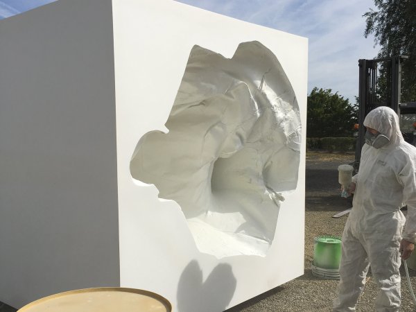 Imposing white bloc, evocative of the marble from the famous Carrara mines. But instead of the caresses of the chisel shaping the athletic body of the Renaissance Men, reason envelopes, vanquishers of nature and chaos... they represent the repeated strikes of a pickaxe.