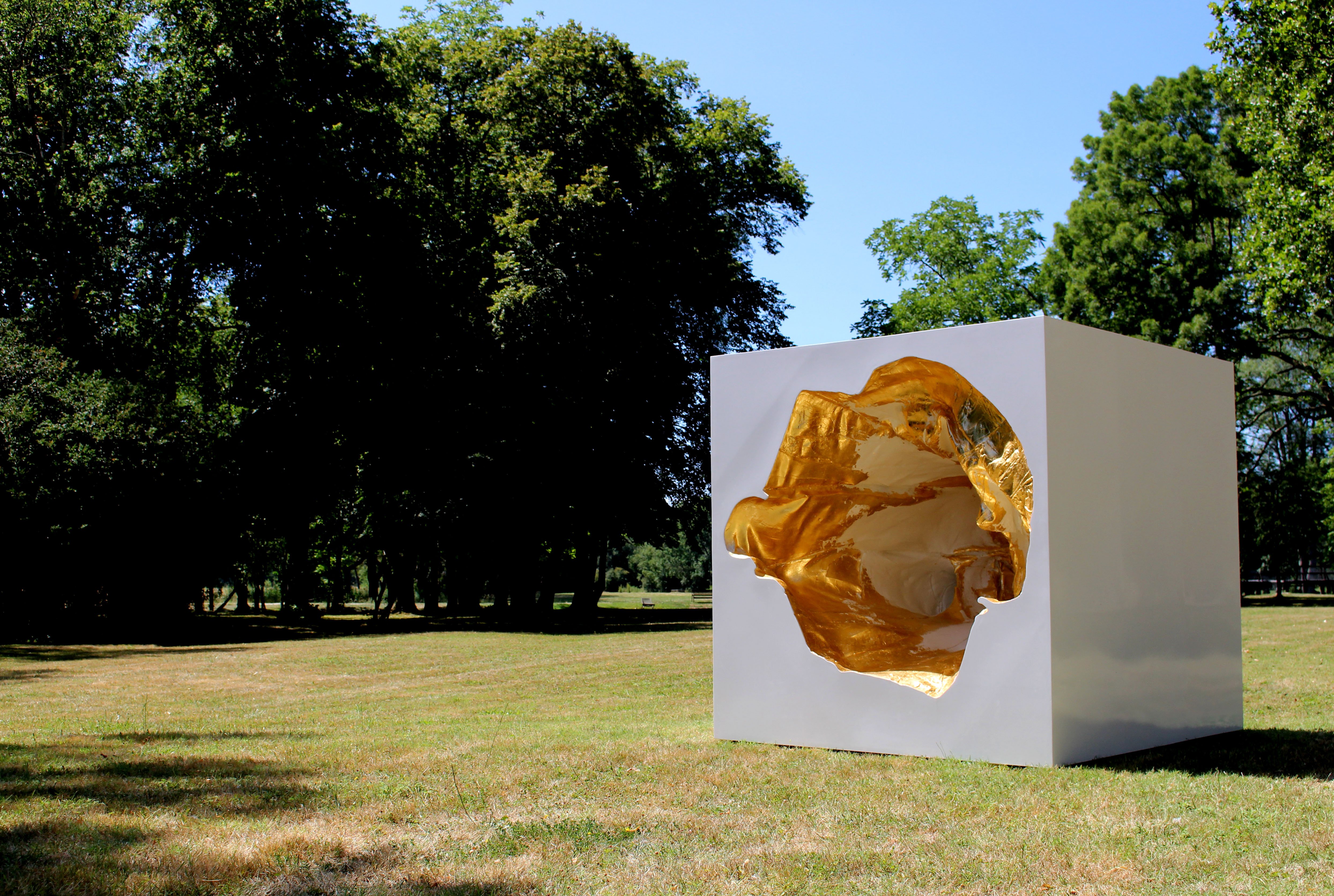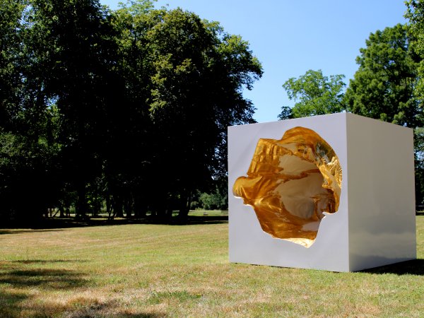 Résine, acier, peinture laquée, vernis haut brillant, dorure, feuille d’or 22 carats. 225 x 225 x 225 cm. Pièce unique.